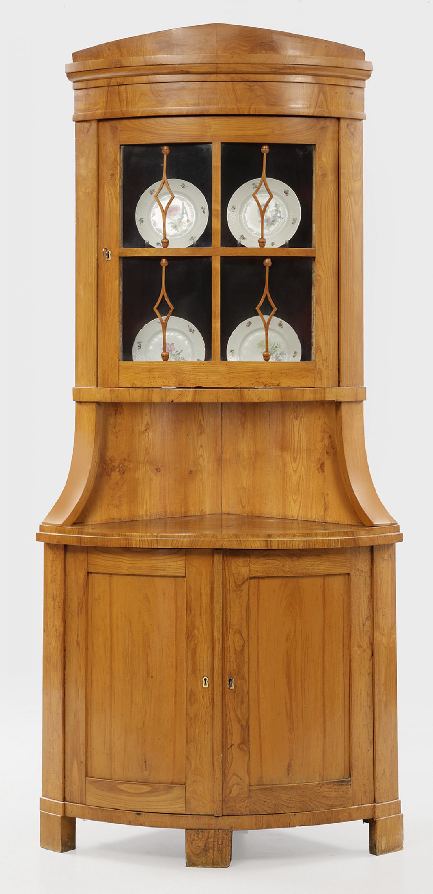 Biedermeier-Eckvitrinenschrank Eschenholz. Bombierter, zweitüriger Korpus auf gekanteten Füßen. Geschweift ansteigende Streben für korrespondierenden, eintürig sprossenverglasten Vitrinenaufsatz mit Profilgesims und flachem Giebelabschluss. H. 229 cm. Schenkel-T. 110,5 cm.