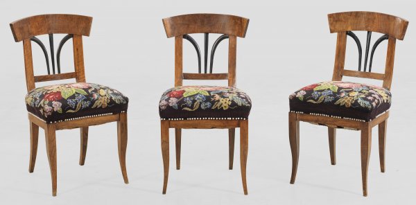 Drei Biedermeier-Stühle Nussbaum, furniert und teilw. ebonisiert. Trapezförmige, rückwärtig bombierte Zarge auf sich stark verjüngenden, leicht ausgestellten Vierkantbeinen. Rückenlehne mit gewölbtem oberen Abschluss sowie Mittelstegen aus stilisiertem Schilfblatt. Sitzfläche gepolstert und mit Petit Point-Stickerei bezogen. Sitz-H. 48 cm.