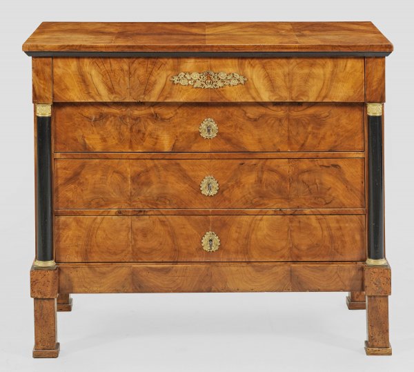 Biedermeier-Kommode Nussbaum, furniert sowie teilw. ebonisiert. Gerader, querrechteckig angelegter Korpus, flankiert von eingestellten Halbsäulen auf gerader Zarge und gekanteten Füßen. In der gegliederten Front vier breite, teilw. leicht vorkragende Schubladen unterschiedlicher Größe. Gering überstehende Deckplatte. Applikationen aus vergoldeter Bronze. H. 89 cm. 105 cm x 47 cm.