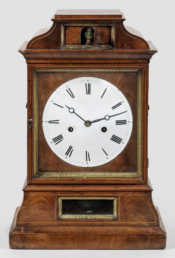 Biedermeier-Kukucksuhr Mahagoni, furniert. Rechteckiges Gehäuse auf seitlich geschweift ansteigendem Sockel mit korrespondierendem oberen Abschluss mit zentralem Türchen und Vogelmechanismus. Verglastes Emailzifferblatt, besch.; Werk aus Holz und Messing. Jeweils abstellbarer Stundenschlag auf Tonfeder sowie Kukucksruf. Altersspuren. H. 48,5 cm.