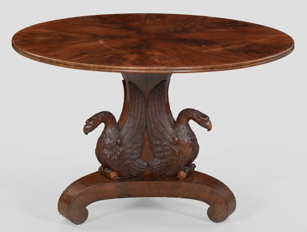 Biedermeier-Salontisch Mahagoni, furniert bzw. teilw. reliefplastisch geschnitzt. Sich konisch verjüngender, leicht konkav eingezogener und abgekanteter Schaft, flankiert von vollplastisch gestalteten Greifen auf volutenförmig eingezogenem Sockel. Runde, umlaufend profilierte Deckplatte mit zentriert angeordneten Furnierfeldern. Glasplatte. H. 76 cm. D. 115 cm.