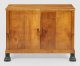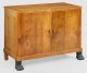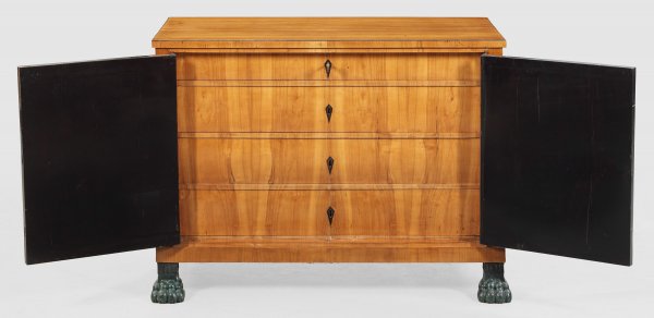 Bedeutender Empire-Sammlungsschrank Kirschbaum, furniert und teilw. ebonisiert sowie geschnitzt und gefasst. Strenge, architektonische Gliederung aus geradem, rechteckig angelegtem Korpus mit seitlichen Rahmenfeldern, flankiert von vorgesetzten Lisenen auf schmaler Zarge und reliefplastisch gestalteten Tatzenfüßen. In der gegliederten Front zwei große Türen. Dahinter Inneneinteilung aus vier breiten Schubladen. Originale Schlösser. Gering überstehende, rechteckige Deckplatte. Rest.; H. 82 cm. 109 cm x 53 cm.
