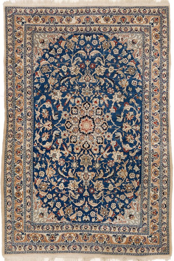 Nain-Brücke Persien. Wolle mit Seidenglanzpunkten auf Baumwolle. Im blauen Innenfeld Zentralmedaillon sowie beigefarbene Ecklösungen. Flächendeckende Musterung aus arabesk angeordneten Blattranken und Vögeln. Umlaufend mehrteilige Bordüre in korrespondierender Farbigkeit. 163 cm x 110 cm.