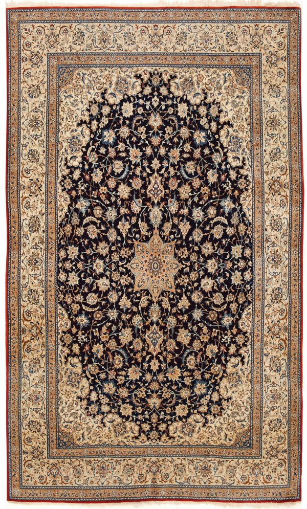 Große Nain "Tudesh"-Brücke Persien. Um 1960. Wolle auf Baumwolle. Sehr feine Knüpfung. Im dunkelblauen Innenfeld sternförmiges Zentralmedaillon sowie breite, passig geschweifte, elfenbeinfarbene Ecklösungen. Flächendeckende Musterung aus üppigen Palmettenranken. Umlaufend breite cremefarbene Bordüre, flankiert von schmalen Bändern. 289 cm x 168 cm.