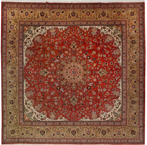 Großer quadratischer Täbris-Teppich Persien. Korkwolle auf Baumwolle mit kleinen Seidenhighlights. Sehr feine Knüpfung. Im roten Innenfeld Zentralmedaillon mit Anhängern sowie breite, passig geschweifte Ecklösungen in Elfenbein. Flächendeckende Musterung aus Blütenrosetten und Palmetten. Umlaufend breite beigefarbene Bordüre aus Palmettenranken. 390 cm x 394 cm.