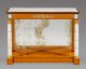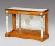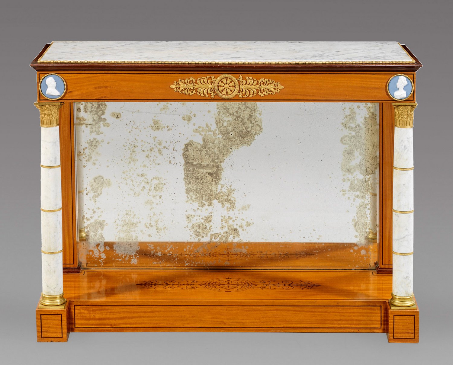 Satinholz, auf Eichenholz furniert sowie Intarsien aus Amaranth. Weißer, hellgrau gemaserter Marmor sowie Applikationen aus feuervergoldeter Bronze und Plaketten aus Sèvres-Porzellan. Gerader, rechteckiger Zargensockel mit vorkragenden vorderen Ecken. Oberhalb davon ausgehend leicht konische, von Blütenbändern umwickelte Vollsäulen mit fein reliefierten Basen und Kapitellen aus Lanzettblättern, Voluten und vollplastisch gestalteten Schwänen sowie breite Pilaster und alt verspiegelte Rückwand als Träger für rechteckigen Zargenkasten. Schauseitig profilgerahmte Portraitmedaillons von Charles Ferdinand Duc de Berry (1778-1820), bez.; Brachard F./1816 sowie seiner Frau Marie-Caroline de Bourbon-Sicile Duchesse de Berry (1798-1870). Großes Rosettenmotiv, flankiert von gestrecktem Blattwerk. Mehrfach profilgerahmte, eingelassene Deckplatte. H. 92 cm. 127 cm x 47 cm.