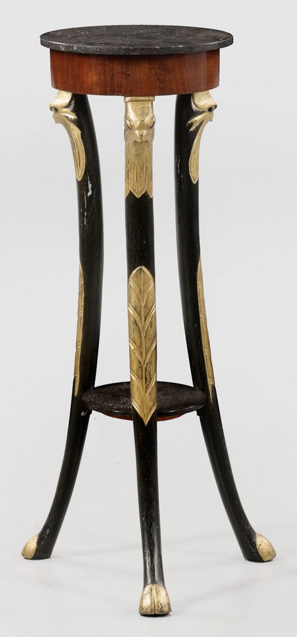 Empire-Guéridon Mahagoni, furniert sowie Holz, geschnitzt, gefasst und teilw. vergoldet. Bombierte Zarge auf gebogten Beinen aus stilisierten Greifen als Träger für runde Deckplatte und korrespondierendes Ablagefach aus dunkelgrauem Marmor. H. 89 cm.