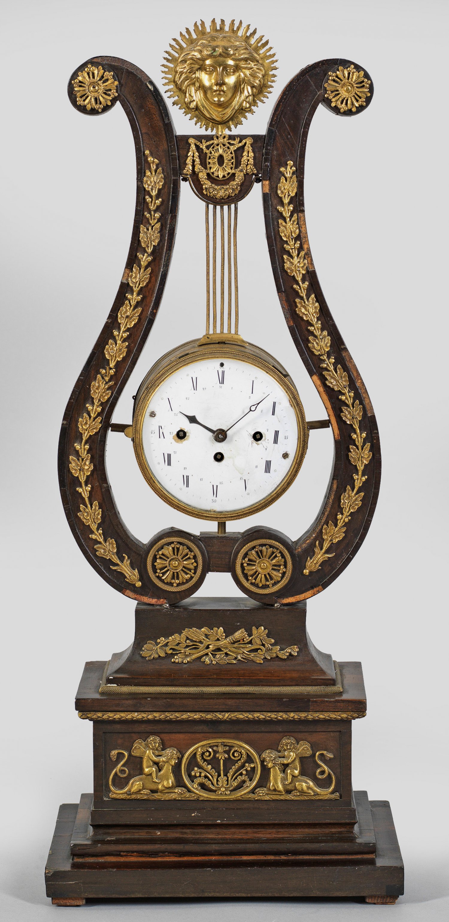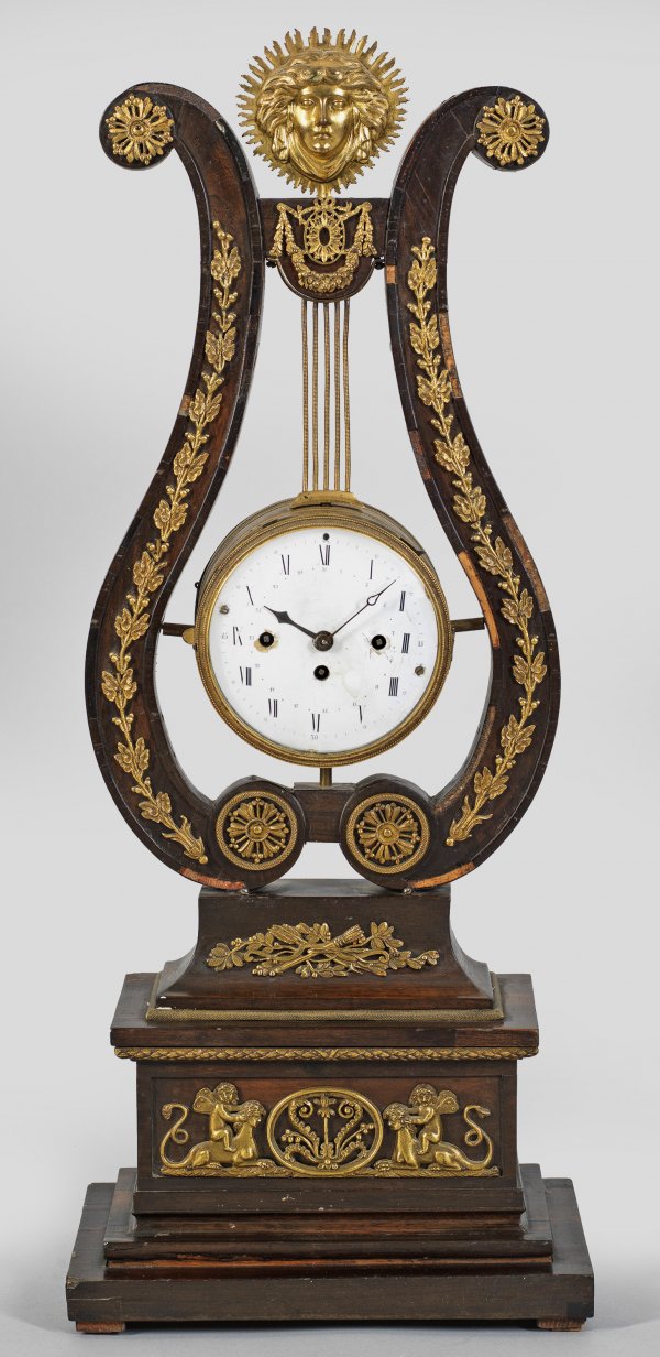 Empire-Lyrapendule Mahagoni, furniert sowie Applikationen aus Bronze. Über gestuft ansteigendem Profilsockel mit erhaben reliefierte Sphinxen lyraförmiger Korpus mit Maskaronbekrönung als Träger für rundes Uhrengehäuse. Starke Altersspuren und unvollständig. H. 60 cm.