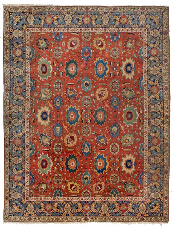 Großer alter Täbris-Teppich Persien. Mitte 20. Jh.; Korkwolle auf Baumwolle. Feine Knüpfung. Auf hellrotem Fond flächendeckende Musterung aus großen, unterschiedlichen Palmettenblüten und kleinem Blattwerk. Umlaufend breite Hauptbordüre, flankiert von unterschiedlichen Blütenbändern. 374 cm x 293 cm.