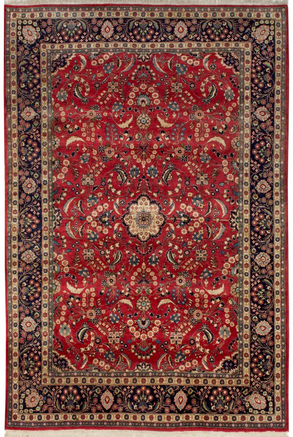 Teppich mit Täbris-Muster Wolle auf Baumwolle. Im roten Innenfeld kleines Zentralmedaillon sowie flächendeckende Musterung aus Blütendolden und Blattwerk. Umlaufend dunkelgrundige Bordüre aus Palmettenmotiven und Blüten, flankiert von schmalen Rosettenbordüren. 303 cm x 207 cm.