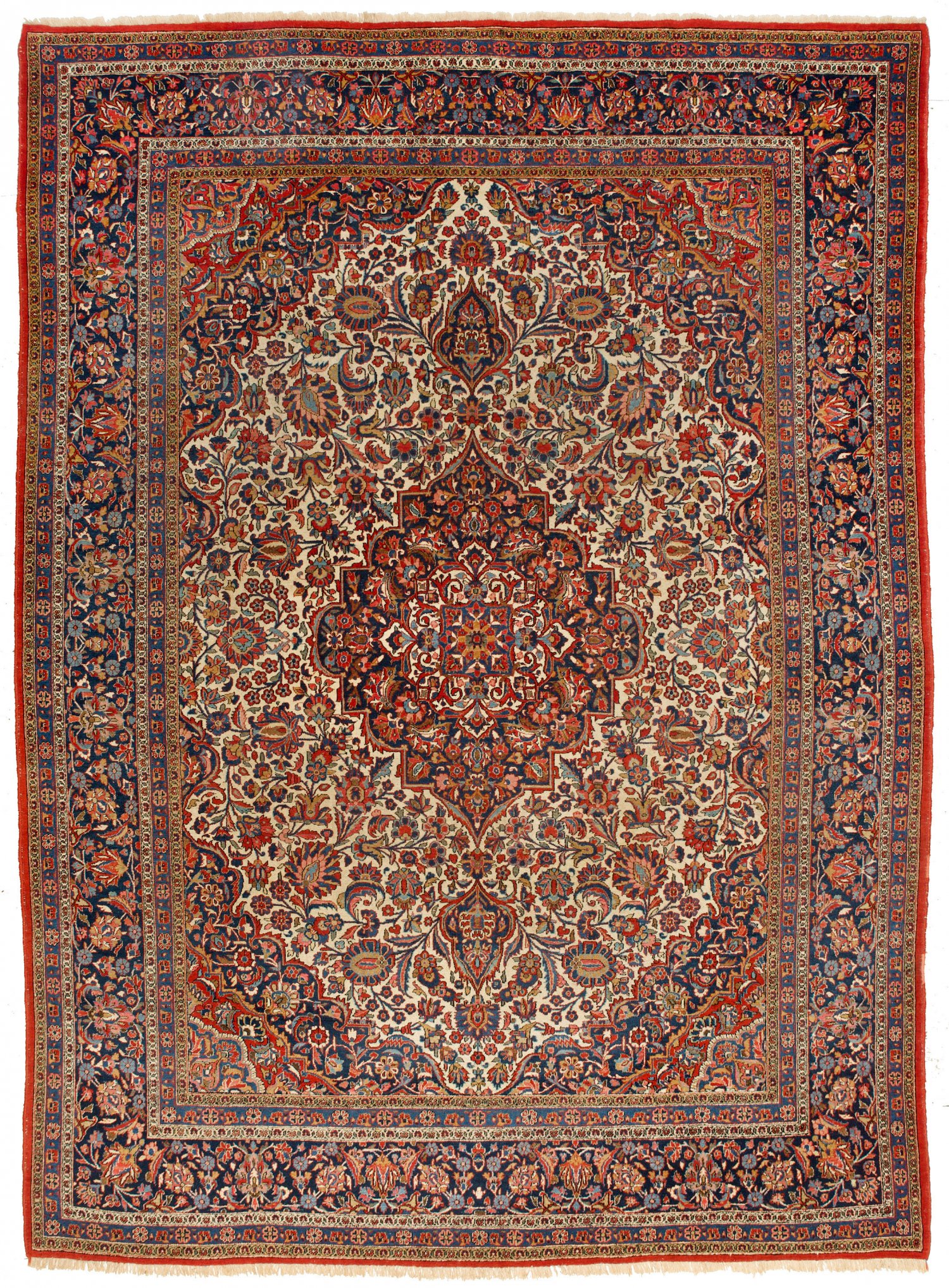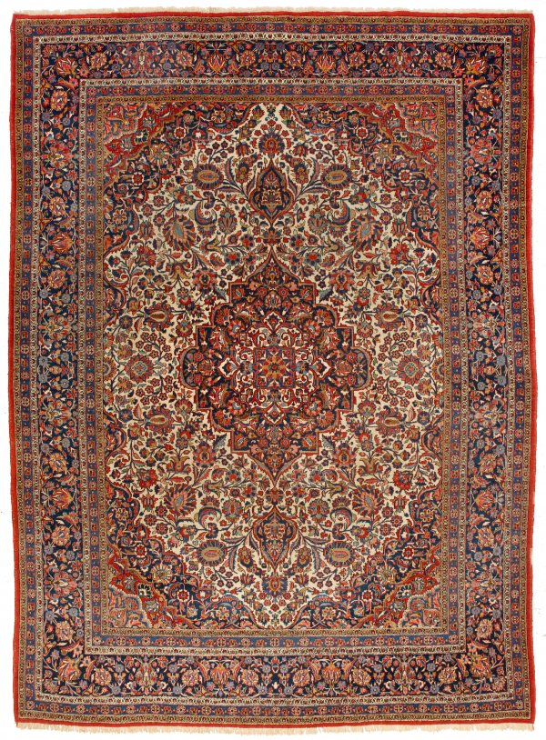 Großer alter Keschan-Teppich Persien. 1. Hälfte 20. Jh.; Wolle auf Baumwolle. Feine Knüpfung. Im passig geschweiften, elfenbeinfarbenen Innenfeld großes, blaues Zentralmedaillon mit Anhängern sowie breite Ecklösungen. Flächendeckende Musterung aus dichten Palmettenranken. Umlaufend breite Bordüre aus Rankenwerk, flankiert von schmalen Nebenbordüren. 374 cm x 274 cm.
