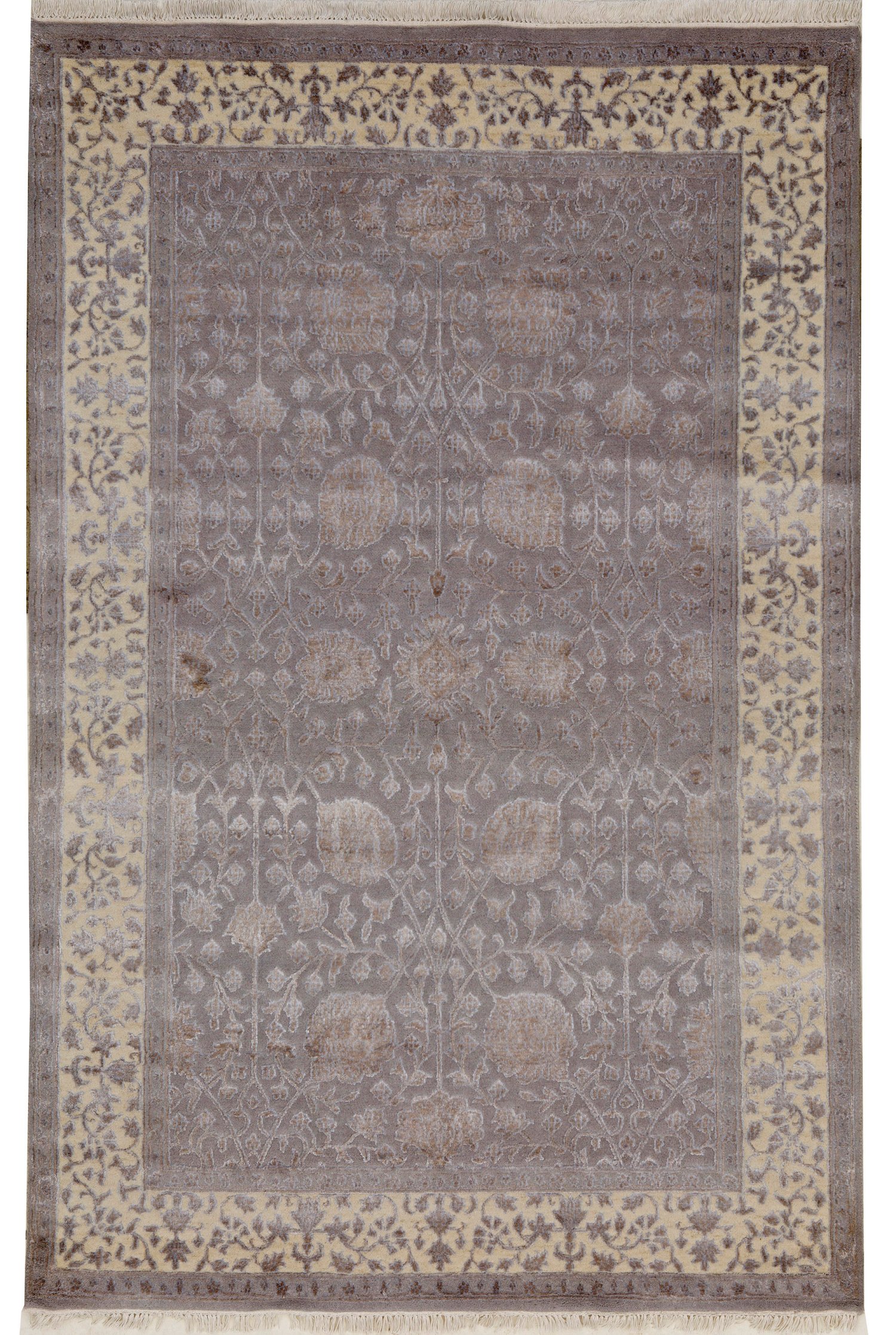 Dekorative Brücke mit Täbris-Muster Wolle mit Seide auf Baumwolle. Im grau-blauen Innenfeld flächendeckende Musterung aus ornamental angeordneten Palmettenranken. Umlaufend breite cremefarbene Bordüre aus feingliedrigem Rankenwerk in korrespondierender Farbigkeit. 187 cm x 121 cm.
