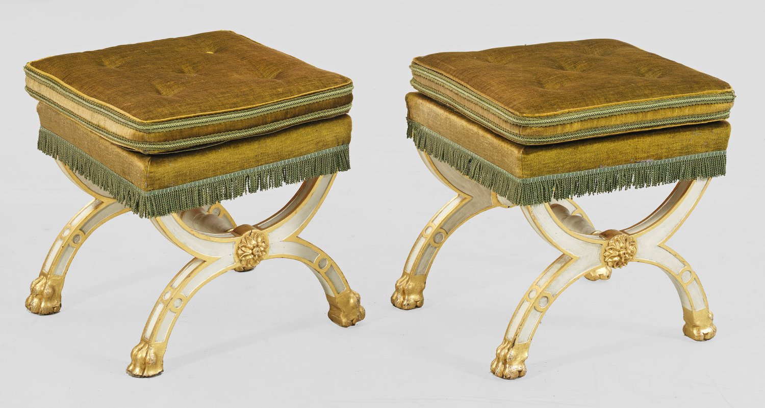 Paar Tabourets im Empire-Stil Holz, weiß gefasst und teilw. vergoldet. Gerade, quadratische Zarge auf scherenförmig angeordneten Beinen mit erhaben reliefierten Blütenrosetten und stilisierten Tatzenfüßen, durch Balusterstab verbunden. Sitzfläche gepolstert und bezogen. H. 50 cm. 50 cm x 50 cm.