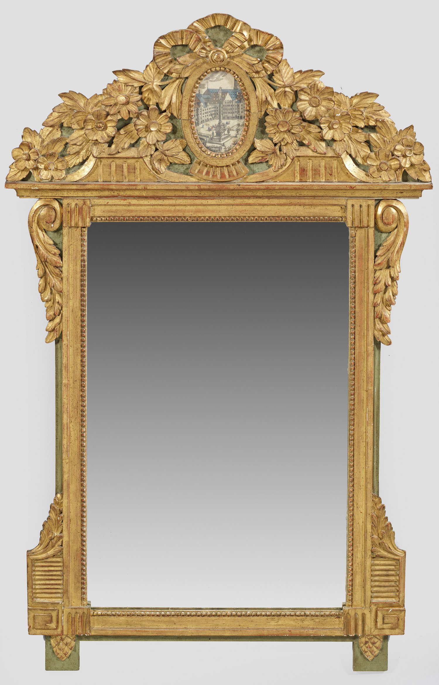 Louis XVI-Wandspiegel Holz, geschnitzt, grün gefasst und teilw. vergoldet. Gerade, hochrechteckige Spiegelrahmung aus Perlstab, flankiert von eingerollten Blattvoluten. Breites, geschweift ansteigendes Giebelfeld aus erhaben reliefierten Blüten sowie in der Mitte schleifenbekröntem Medaillon als Rahmung für polychrome Ansicht eines Platzes. 122 cm x 78 cm.