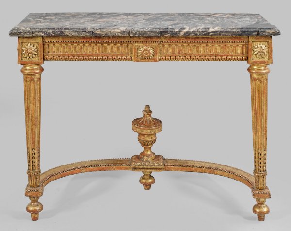 Louis XVI-Konsole Holz, geschnitzt, gefasst und vergoldet. Rechteckige, kannelierte Zarge mit verkröpften Ecken und erhaben reliefierten Blütenrosetten auf sich konisch verjüngenden Balusterbeinen, unterhalb durch breiten stark gebogten Steg mit großer Vasenbekrönung verbunden. Korrespondierende, gering überstehende Deckplatte aus dunkelgrauem, roséfarben und dunkelrot gemasertem Marmor. H. 78,5 cm. 110 cm x 45,5 cm.
