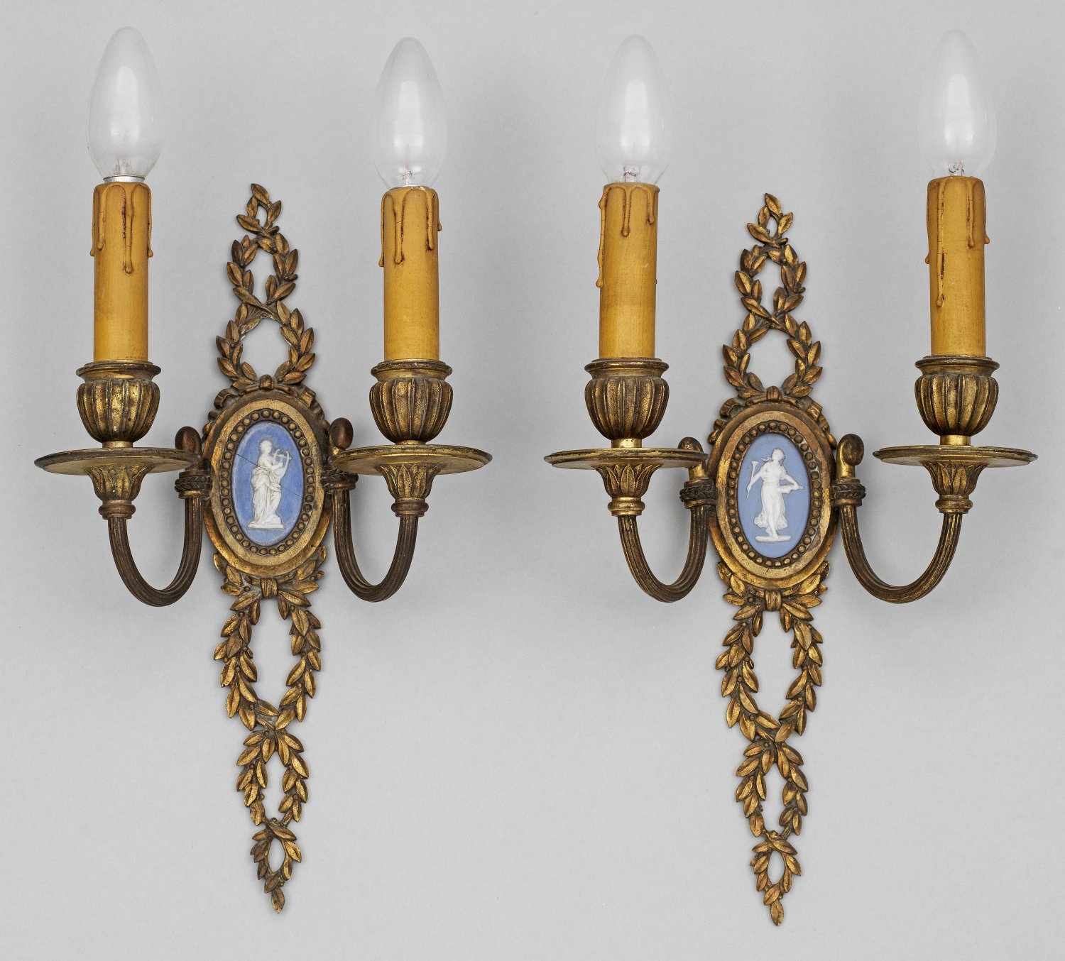 Paar Wandappliken im Louis XVI-Stil 2-flg.; Bronze mit Resten alter Vergoldung sowie eingelassene, teilw. besch. Plaketten aus Biskuitporzellan im Wedgewoodstil. Durchbrochen gearbeitetes Wandschild aus profilgerahmten Medaillon sowie Lorbeerblatt als Träger für gebogte Leuchterarme mit vasenförmigen Tüllen. Elektrifiziert. H. 33,5 cm.