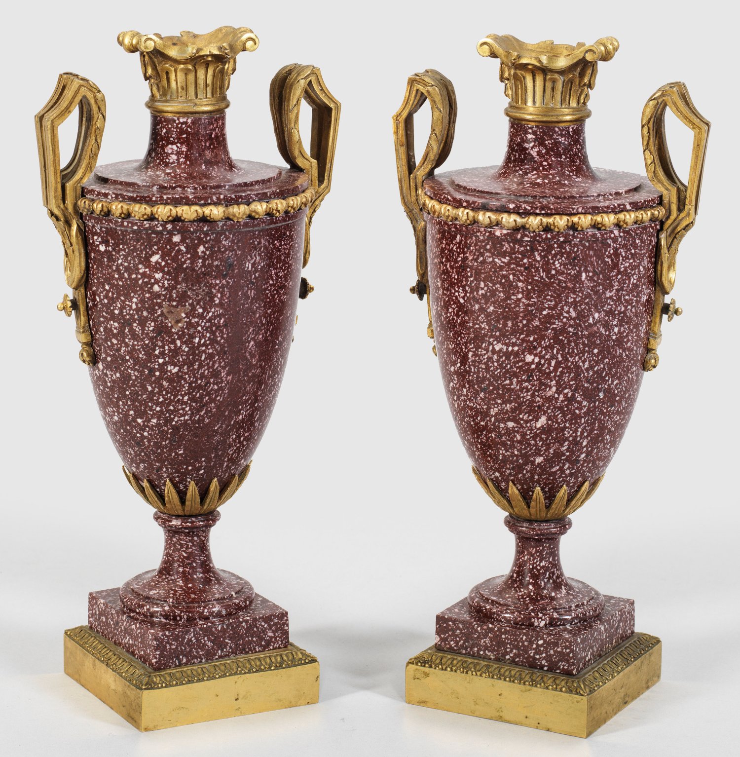 Paar hochqualitätvolle französische Porphyrvasen Purpurfarbener, weiß, schwarz und roséfarbener, fein gesprenkelter ägyptischer Porphyr sowie feuervergoldete Bronze. Über quadratischem, gestuft ansteigendem Sockel mit Palmettenfries amphorenförmiger, glatt nach oben ziehender Korpus mit betont kantig einziehender Schulter, applizierten Lanzettblättern und schmalem Akanthusfries. Seitlich hochaufgeworfene, paarweise angeordnete Henkel aus gekanteten Voluten und Draperie. Oberer Abschluss mit Zungenfries und reliefierten Voluten. H. 28,5 cm.