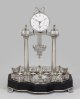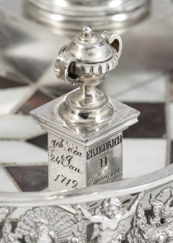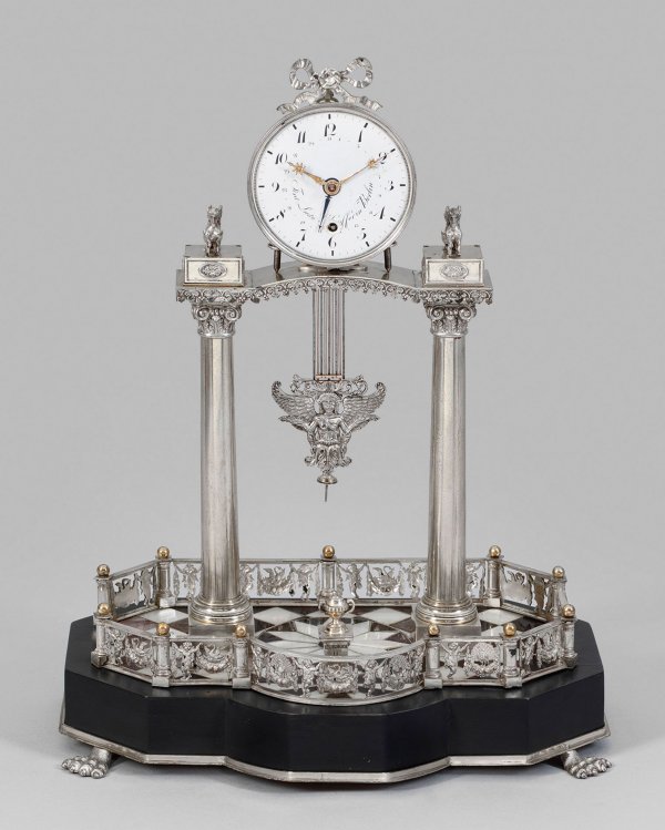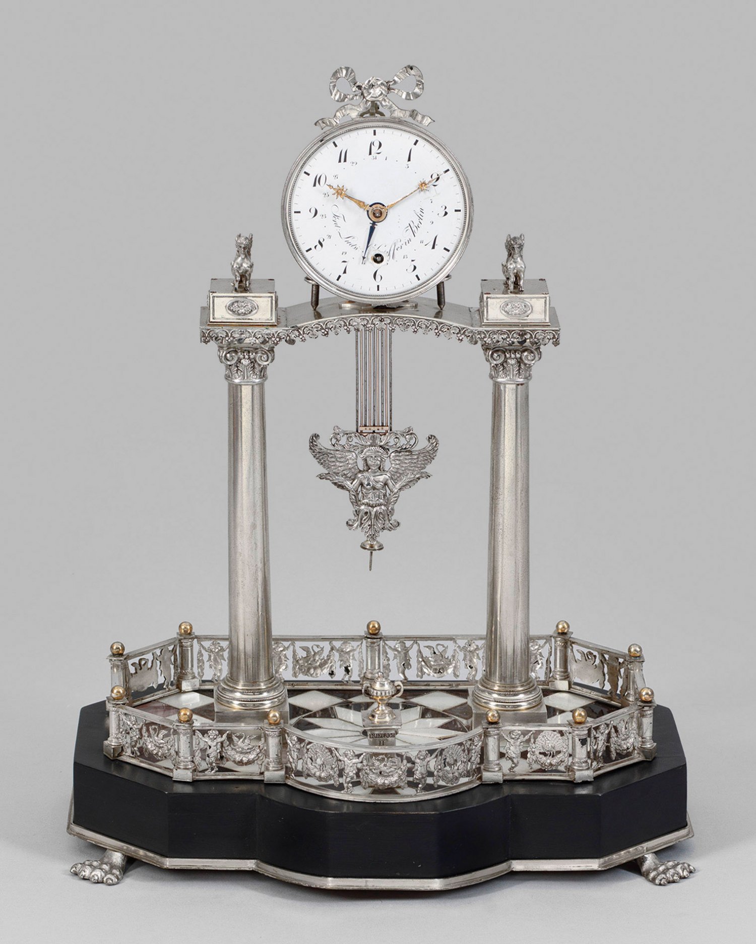 Silber und Perlmutter sowie ebonisiertes Holz. Architektonisch gegliedertes, offen gestaltetes Gehäuse aus konischen Vollsäulen mit reliefierten Basen und korinthischen Kapitellen als Träger für schmales Gesims mit Fries aus Weinlaub sowie gekanteten Podestsockeln mit erhaben reliefierten Rosetten als Träger für vollplastisch gestaltete Sphinxen. In der Mitte rundes, profilgerahmtes Emailzifferblatt mit Schleifenbekrönung, bez. Ferd. Ludw. (...)ffer in Berlin, minim. besch. Datumsanzeige sowie arabische schwarze Zahlen. Fein reliefierte goldene Zeiger mit Sonnenmotiven. Mechanisches 14-Tage Werk mit Räderwerk aus Silber, ruhende Stiftenhemmung mit Scherengang sowie sog. Rostpendel mit reliefplastisch gestalteter Pendellinse in Form einer Viktoria. Gekanteter, profilierter Podestsockel auf reliefplastischen Tatzenfüßen mit durchbrochen gestalteter, weit zurückgesetzter Galerierahmung aus Puttenkindern mit Rosenfestons sowie Schwänen und Pfauen. Flächendeckende Würfelmarketerie aus hellem und dunklem Perlmutter sowie feingliedrigen Stegen. Im Vordergrund kleiner Podestsockel mit Vasenbekrönung, bez. Friedrich II König von Preußen sowie geb. den 24. Jan. 1712; gest. den 17. Aug. 1786. Dazu ebonisierter Holzsockel und Glassturz. Uhren-H. 37 cm. 28 cm x 17 cm.
