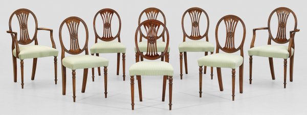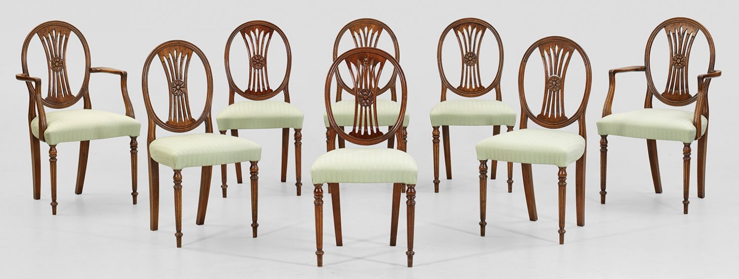 Satz von acht Louis XVI-Stühlen Paar Armlehnstühle und sechs Stühle. Mahagoni. Bombierte Zarge auf schlanken, kannelierten Balusterbeinen. Geschweift ansteigende Stützen für gebogte Armlehnen sowie hochovale Rückenlehnenrahmung mit durchbrochen gearbeitetem Mittelsteg. Sitzfläche gepolstert und bezogen. Sitz-H. 49 cm.