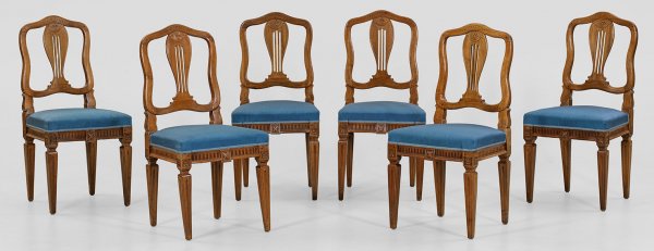 A set of six German walnut Louis XVI chairs.