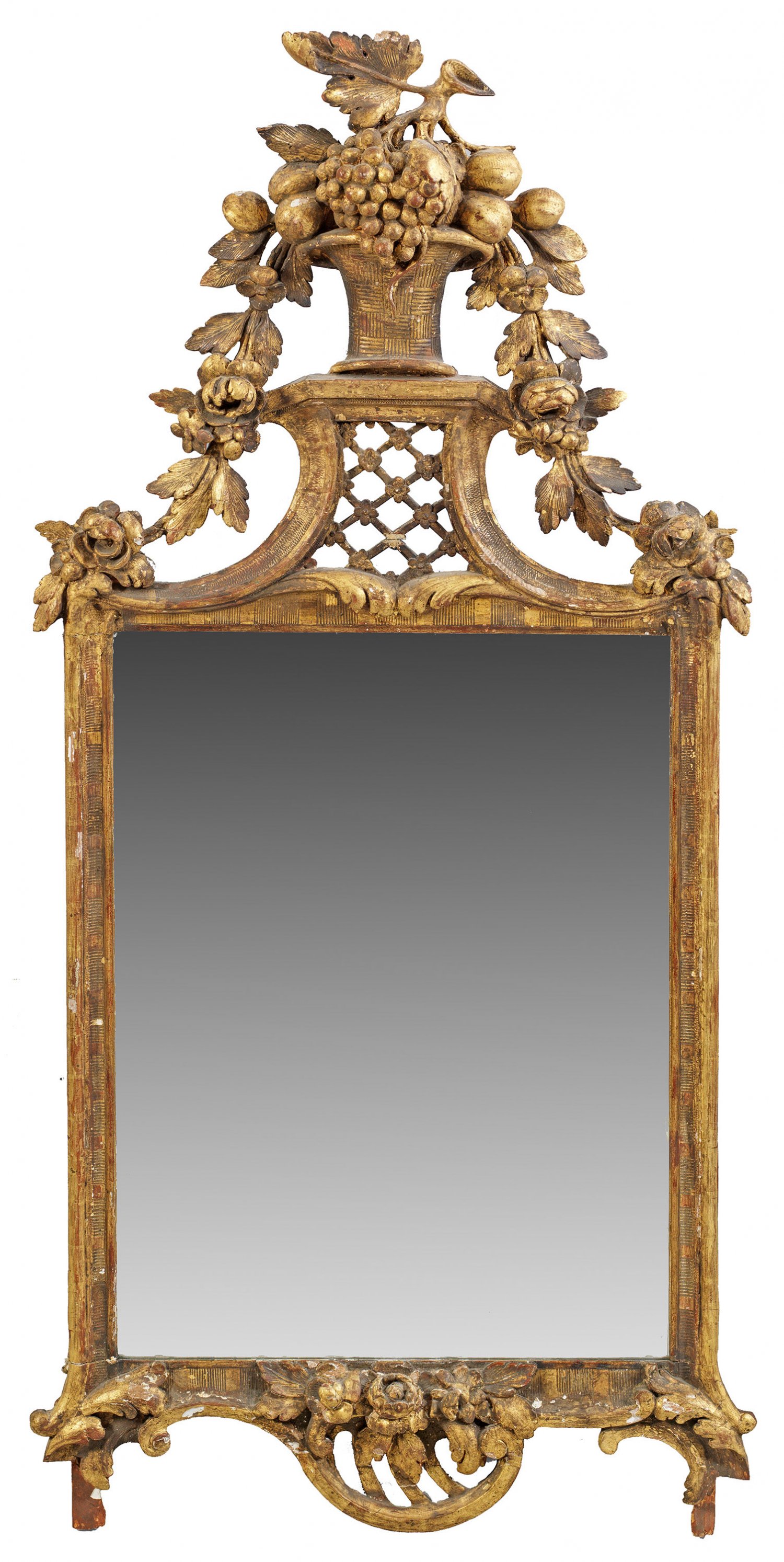 Großer Transition-Wandspiegel Holz, geschnitzt, gefasst und vergoldet. Hochrechteckige, profilierte Spiegelrahmung aus Rocaillen und Blattwerk. Hochaufgeworfenes, durchbrochen gearbeitetes Giebelfeld aus Rocaillestreben und Gitterwerk. Oberhalb Bekrönung aus erhaben reliefiertem Fruchtkorb, flankiert von üppigen Rosenfestons. 138 cm x 66 cm.