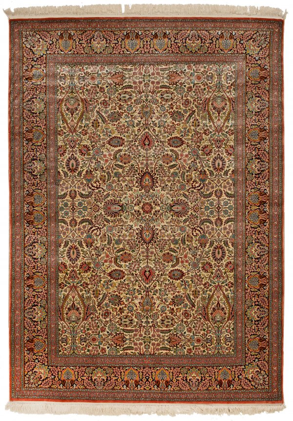 Kaschmir-Seidenbrücke Indien. Seide auf Seide. Sehr feine Knüpfung. Auf cremefarbenem Fond flächendeckend dichte Musterung aus üppigen Blütenranken. Umlaufend breite Bordüre aus dicht angeordneten Palmetten. 225 cm x 155 cm.