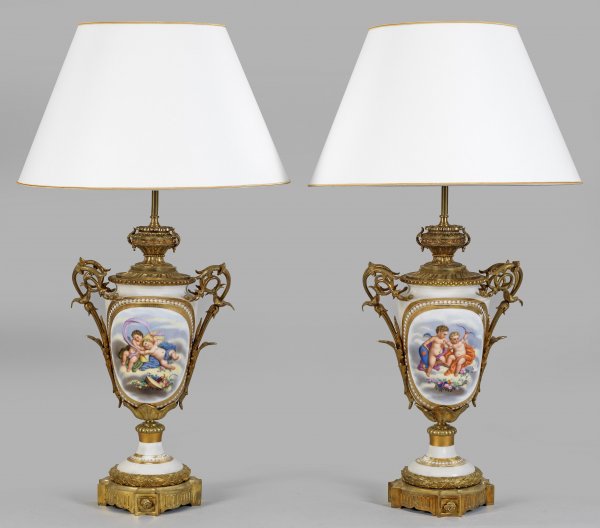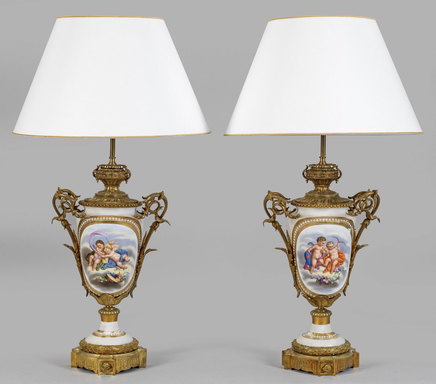 Paar Louis XVI- Tischlampen 1-flg.; Bronze, feuervergoldet. Porzellan. Runder, vierfach ausgezogener Sockel mit reliefiertem Lorbeerfries. Über Rundfuß ovoider Korpus mit abgesetzten, konkav einschwingendem Hals, in reliefplastisch verzierte, vasenförmige Bekrönung übergehend. Seitlich aufsteigende Handhaben in Form von eingerollten Blattvoluten. Beidseitig der Wandung große, goldradierte Ornamentreserve mit Perlschnur, darin auf Wolken schwebende Putti mit verschiedenen Attributen bzw. farbenprächtiges Blumenarrangement in polychromer Malerei. Konischer Lampenschirm. Elektrifiziert. Ges.- H. 85 cm.