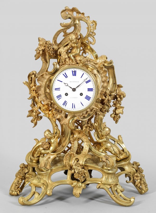 Große Rokoko-Pendule Bronze, vergoldet. Balusterförmiger, asymmetrisch gestalteter, durchbrochen gearbeiteter Korpus aus üppigen, eingerollten Volutenmotiven und Rocaillen, umgeben von Rosenfestons mit Trauben. Vollplastisch gearbeitete Puttenkinder. Verglastes Emailzifferblatt, bez. Rodier à Paris. Pendulenwerk mit Fadenaufhängung sowie Halbstundenschlag auf Glocke. Platine bez. Rodier à Paris sowie Pons. Unw. besch.; H. 59 cm. 47 cm x 24 cm.