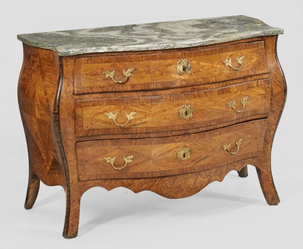 Rokoko-Kommode Rüster und Nussbaum, furniert. Dreiseitig bombierter Korpus, flankiert von schlanken, weit ausgezogenen Ecklisenen, in ausgestellte Füße übergehend. In der gegliederten Front drei breite Schubladen. Flächendeckend breit gerahmte Rautenfelder. Gering überstehende, erg. Deckplatte aus grau-grün gemasertem Marmor. H. 77 cm. 108,5 cm x 53 cm.