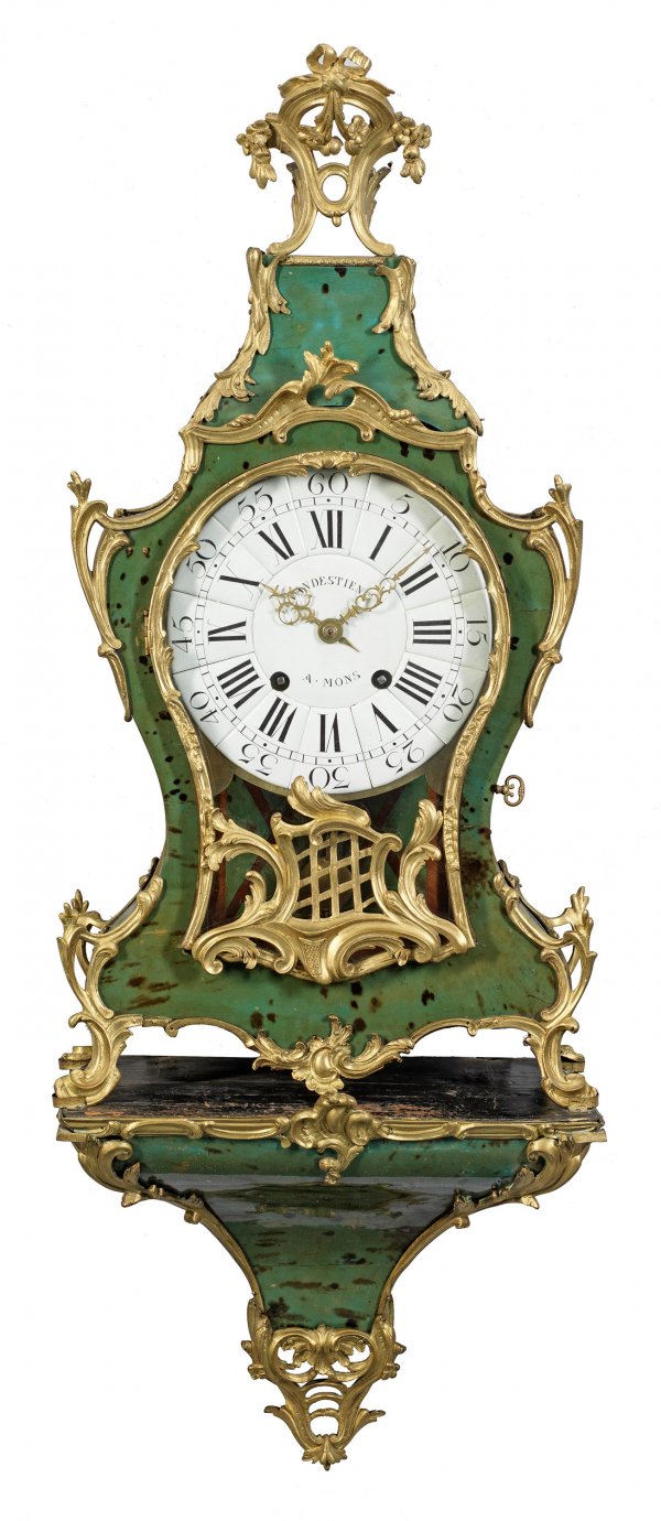 Große Louis XV-Pendule von Nicolas Pierre Séverin Flächendeckender Fond aus seegrün hinterlegtem, lackierten Schildpatt sowie vergoldete Bronze. Balusterförmiger Korpus, umgeben von durchbrochen gearbeiteten Rocaillen mit geschweift ansteigendem oberen Abschluss sowie stark vorkragender durchbrochen gearbeitete Bekrönung aus Volutenspangen und Blüten. Schlagstempel-Sig. N.P. SEVERIN (wird Meister 1757). Verglastes Zifferblatt aus großen Emailreserven, bez. Vandestine à Mons. Werk mit Fadenaufhängung sowie Halbstundenschlag auf Glocke. Unterhalb korrespondierende Wandkonsole. Ges-H. 110 cm. 40 cm x 23 cm.