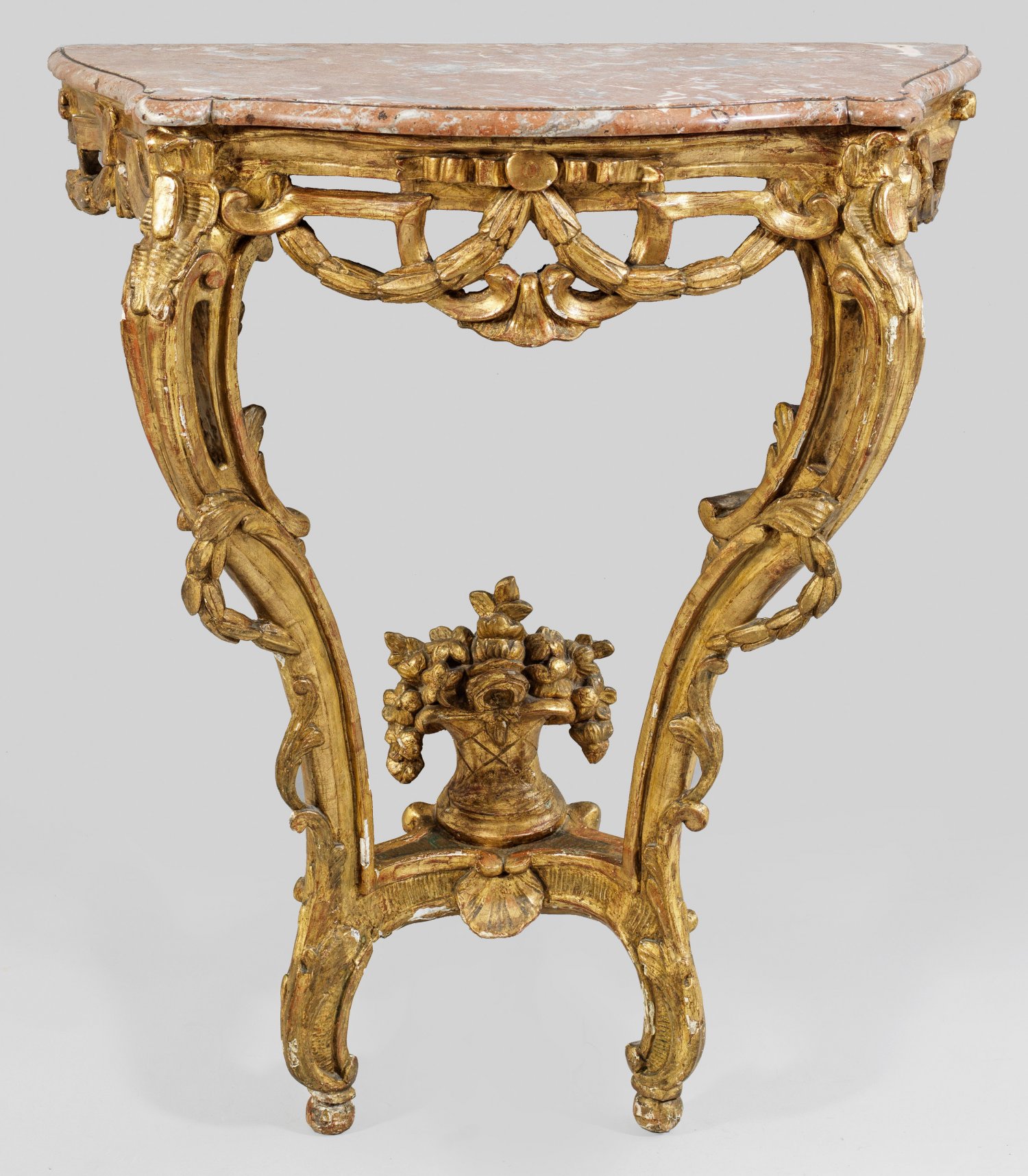 Rokoko-Konsole Holz, geschnitzt, stuckiert, gefasst und vergoldet. Bombierte, durchbrochen gearbeitete Zarge aus Volutenspangen und Lorbeerfestons auf stark geschwungenen Beinen aus gegenläufigen Voluten, unterhalb durch gebogten Steg mit Vasenbekrönung verbunden. Gering überstehende, profilierte Deckplatte aus rotbraunem, hellgrau und weiß gemasertem Marmor. H. 85,5 cm. 72 cm x 39 cm.