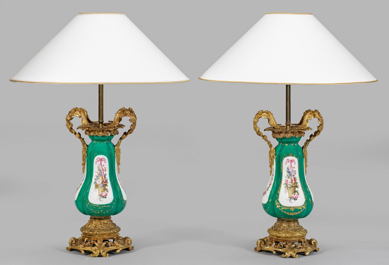 Paar Louis XV-Tischlampen 1-flg.; Bronze, vergoldet. Porzellan. Über durchbrochen gearbeitetem Sockel mit Reliefdekor kürbisförmig aufsteigender Korpus mit vierfach eingezogener Wandung, seitliche Henkel in Gestalt von reliefplastischem Blattwerk. Auf der Wandung, in smaragdgrünem Fond, ausgesparte Reserven mit farbenprächtigen Blumenbuketts im Wechsel mit Blumenfestons in polychromer Malerei. Minim. ber.; Konischer Lampenschirm. Elektrifiziert. H. 66 cm.