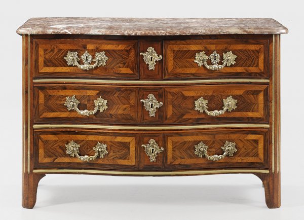 Große Regence-Kommode Palisander, furniert. Gerader Korpus, flankiert von gerundeten Ecklisenen mit Messingkanneluren, in entsprechende Füße übergehend. In der gegliederten Front vier bombierte Schubladen unterschiedlicher Größe. Flächendeckend breit gerahmte, gespiegelt angeordnete Furnierfelder. Üppige Beschläge aus Bronze. Dem Korpus entsprechende, gering überstehende Deckplatte aus rotbraunem, hellgrau und weiß gemasertem Marmor. H. 84,5 cm. 130 cm x 65 cm.