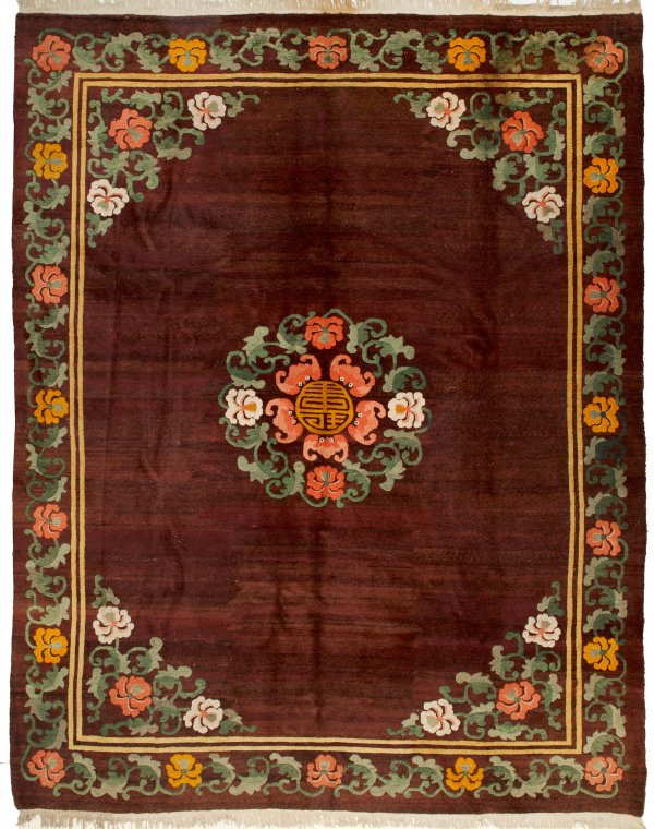 Großer Art Déco-Salonteppich Mongolei. 1930er Jahre. Wolle auf Baumwolle. Auf monochromem auberginefarbenen Fond Zentralmedaillon aus Shou-Symbol, Fledermäusen und grünen Blattranken. Korrespondierende Ecklösungen. Innenfeld begrenzt von schmalen gelben Bändern sowie breiter Bordüre mit korrespondierendem Muster. 348 cm x 279 cm.
