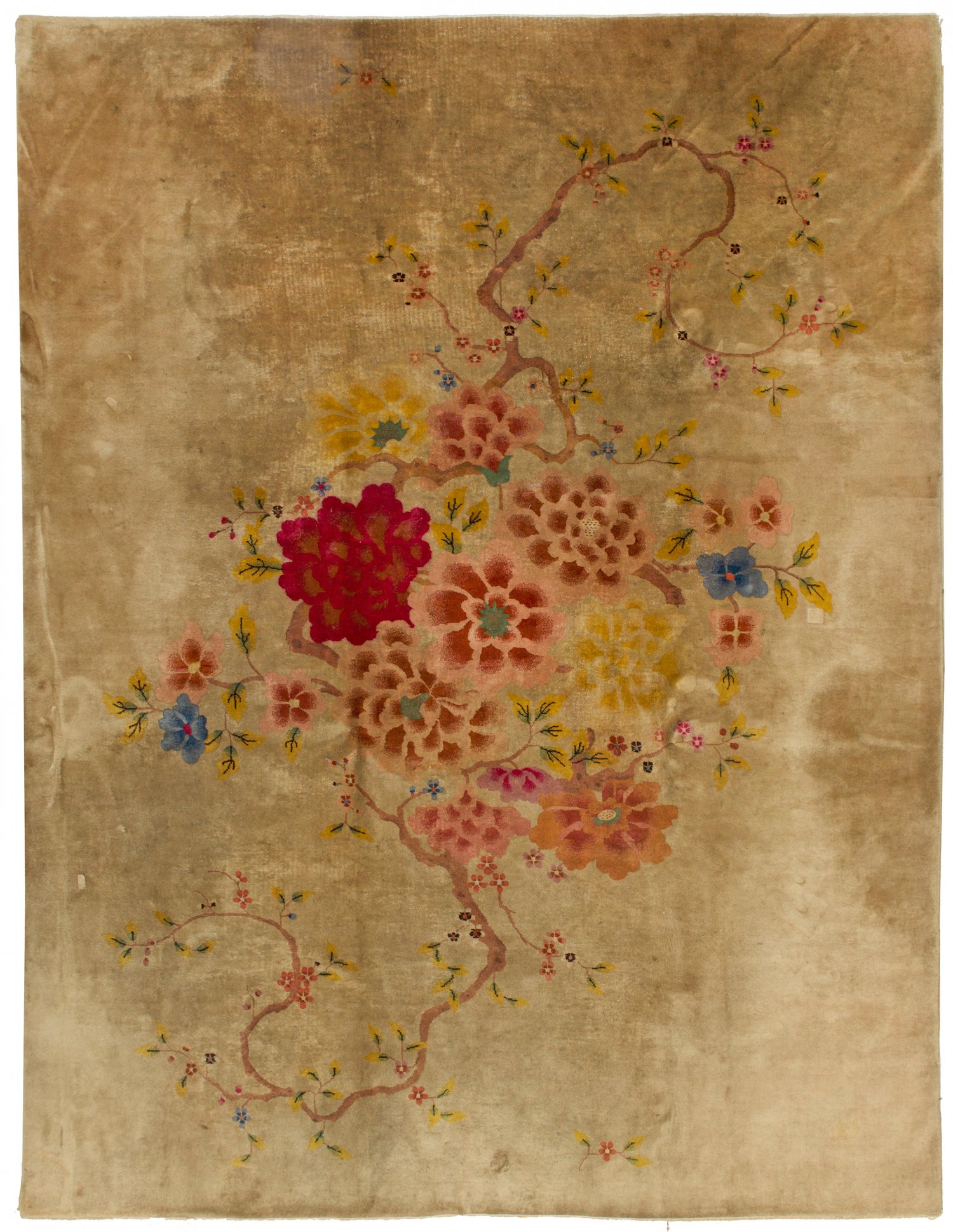 Großer Art Déco-Teppich China für Nichols, London. Um 1930. Manchesterwolle auf Baumwolle. Auf beigefarbenem, changierendem Fond großzügig angelegtes Arrangement aus großen Päonienblüten in unterschiedlichen Rottönen, begleitet von arabesk geschwungenem Astwerk. 346 cm x 268 cm.