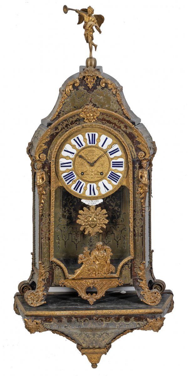 Große Louis XIV-Boulle Uhr mit Konsole Flächendeckender Fond aus Horn und ornamentiertem Messing in sog. Boulle-Technik. Hochrechteckiger, dreiseitig verglaster Korpus auf weit ausladenden Volutenfüßen mit segmentförmigem oberen Abschluss. Geschweift ansteigende Bekrönung mit vollplastisch gestalteter Fama. Ornamentiertes Zifferblatt aus Emaillereserven, bez. I Le Maire à Paris. Mechanisches Werk mit Pendelfeder sowie Halbstundenschlag auf Glocke. Korrespondierende Konsole, flankiert von Maskarons. Besch. und teilw. rep.; Ges.-H. 149 cm. 46 cm x 24 cm.