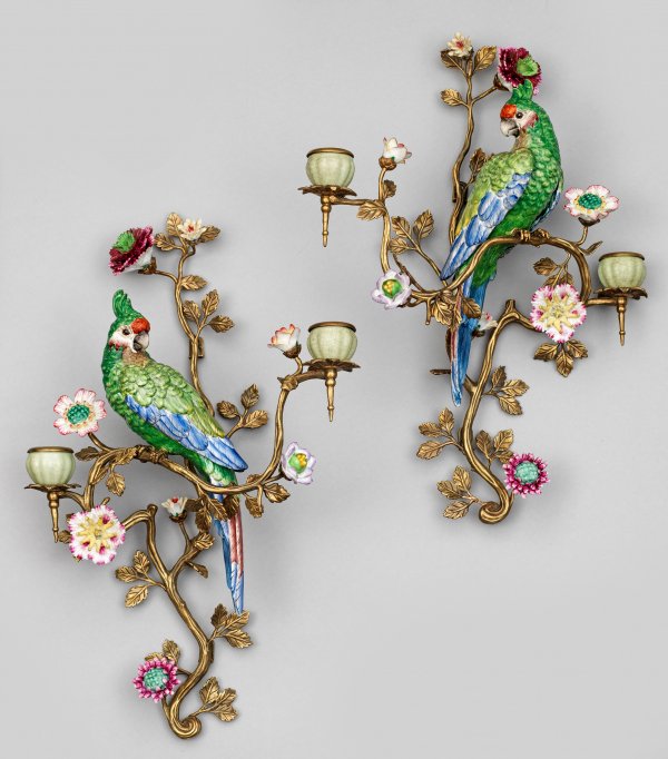 Paar figürliche Wandappliken 2-flg.; Messing. Porzellan. Aufsteigende, sich weit verzweigende Blattranke, sich in astförmig geschwungenen Leuchterarmen mit großen Porzellablüten verzweigend. Vasenförmige Tüllen über blattartig reliefierte Traufschalen. Mittig sitzender, farbenprächtiger Papagei mit naturalistisch gestaltetem und staffiertem Gefieder. Unw. rest.; H. 49 cm.