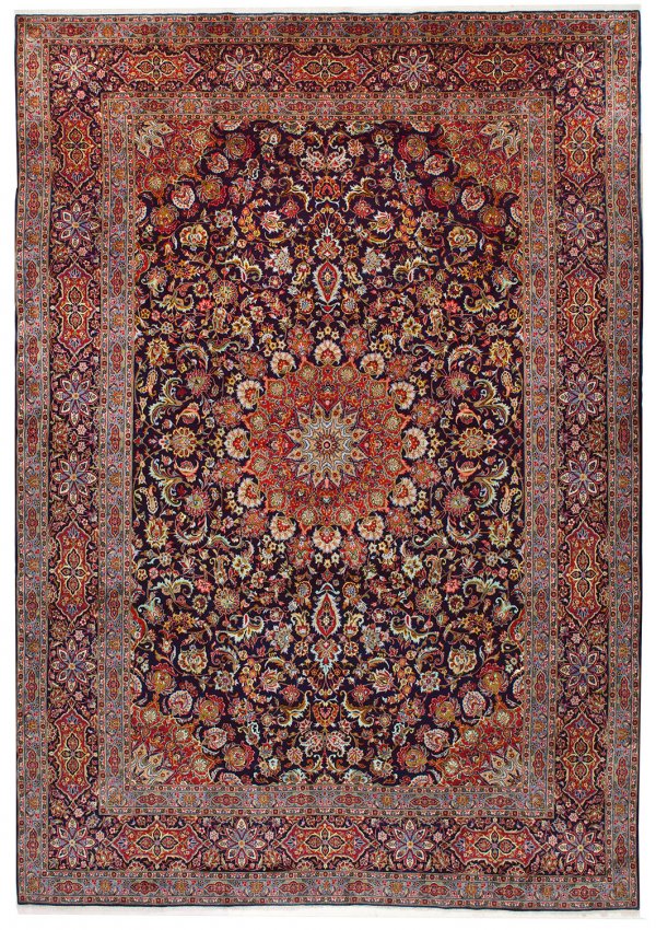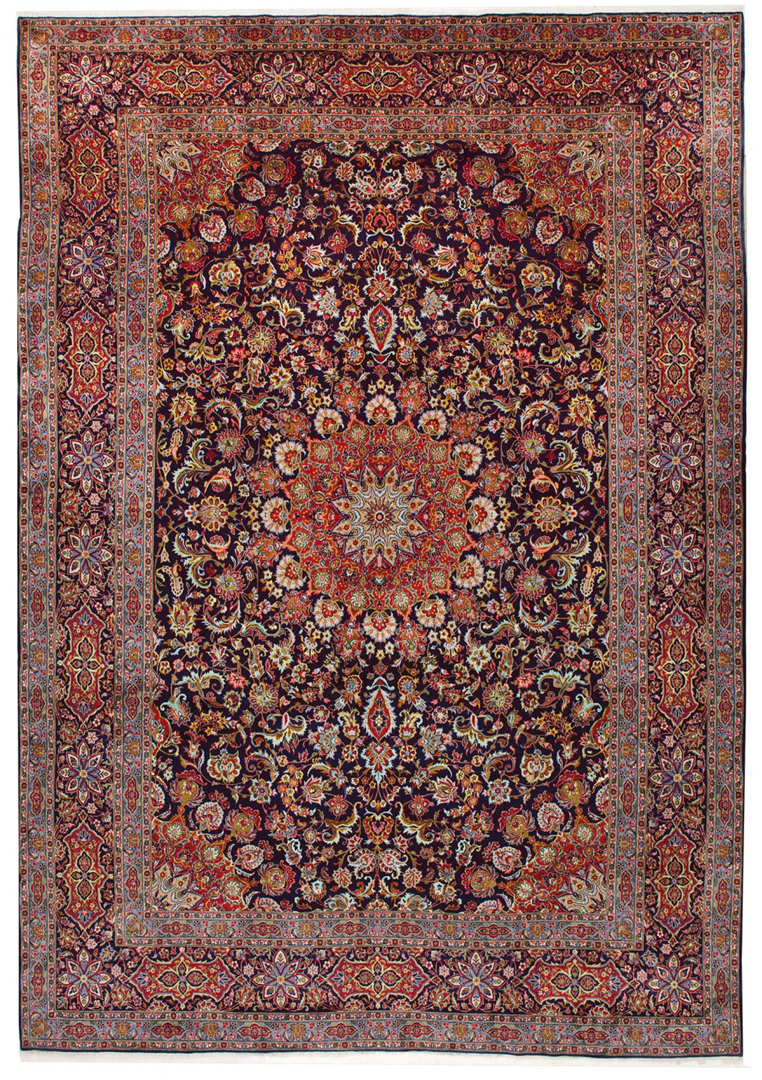 Großer eleganter Keschan-Teppich Persien. Wolle mit Seide auf Baumwolle. Auf dunkelblauem Fond großes Zentralmedaillon mit umlaufenden Palmettenanhängern sowie korrespondierende Ecklösungen. Flächendeckend dichte Musterung aus üppigen Blütenranken. Umlaufend breite Hauptbordüre mit Kartuschenmotiven, flankiert von hellblauen Nebenbordüren. 422 cm x 300 cm.