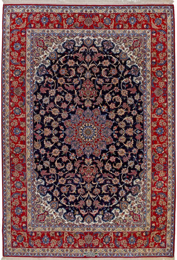 Großer signierter Isfahan-Teppich Persien. Korkwolle und Seide auf Seide. Im dunkelblauen Innenfeld großes Zentralmedaillon mit Anhängern sowie breiten Ecklösungen. Flächendeckend dichte Musterung aus üppigen, arabesk angeordneten Palmettenranken. Umlaufend breite rotgrundige Blütenbordüre, flankiert von schmalen Nebenbordüren. Sign.; 300 cm x 207 cm.