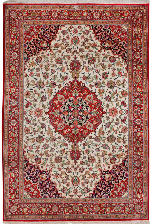 Signierter Täbris-Teppich Persien. Korkwolle auf Baumwolle. Sehr feine Knüpfung. Im elfenbeinfarbenen Innenfeld großes rotgrundiges Zentralmedaillon sowie dunkelblaue Ecklösungen. Flächendeckend dichte Musterung aus Palmettenranken. Umlaufend korrespondierende rote Hauptbordüre. Sign.
