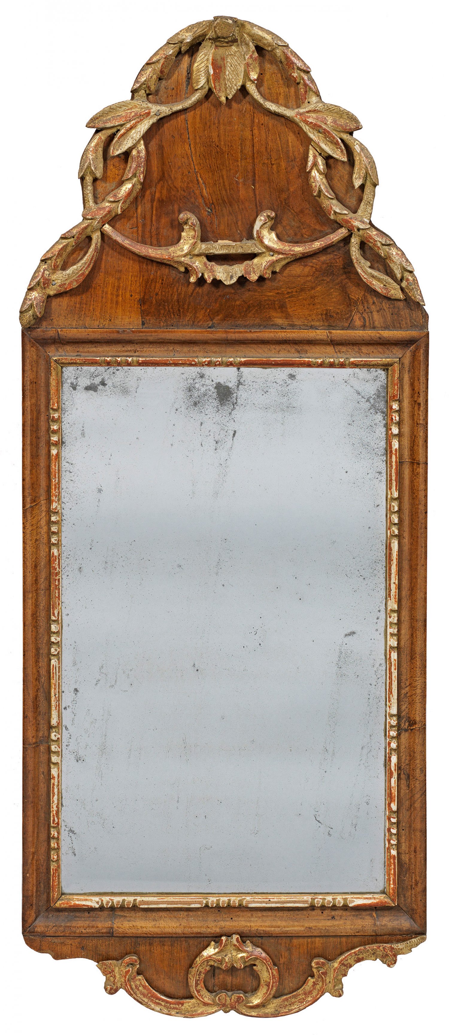 Rokoko-Wandspiegel Nussbaum, furniert sowie Holz, geschnitzt, gefasst und vergoldet. Hochrechteckige, profilierte Spiegelrahmung mit Perlstabfries. Passig geschweiftes, hoch aufgeworfenes Giebelfeld mit erhaben reliefierten, verschlungenen Blattvoluten. Korrespondierender unterer Abschluss. Altes, facettiertes Spiegelglas. 82 cm x 35 cm.