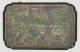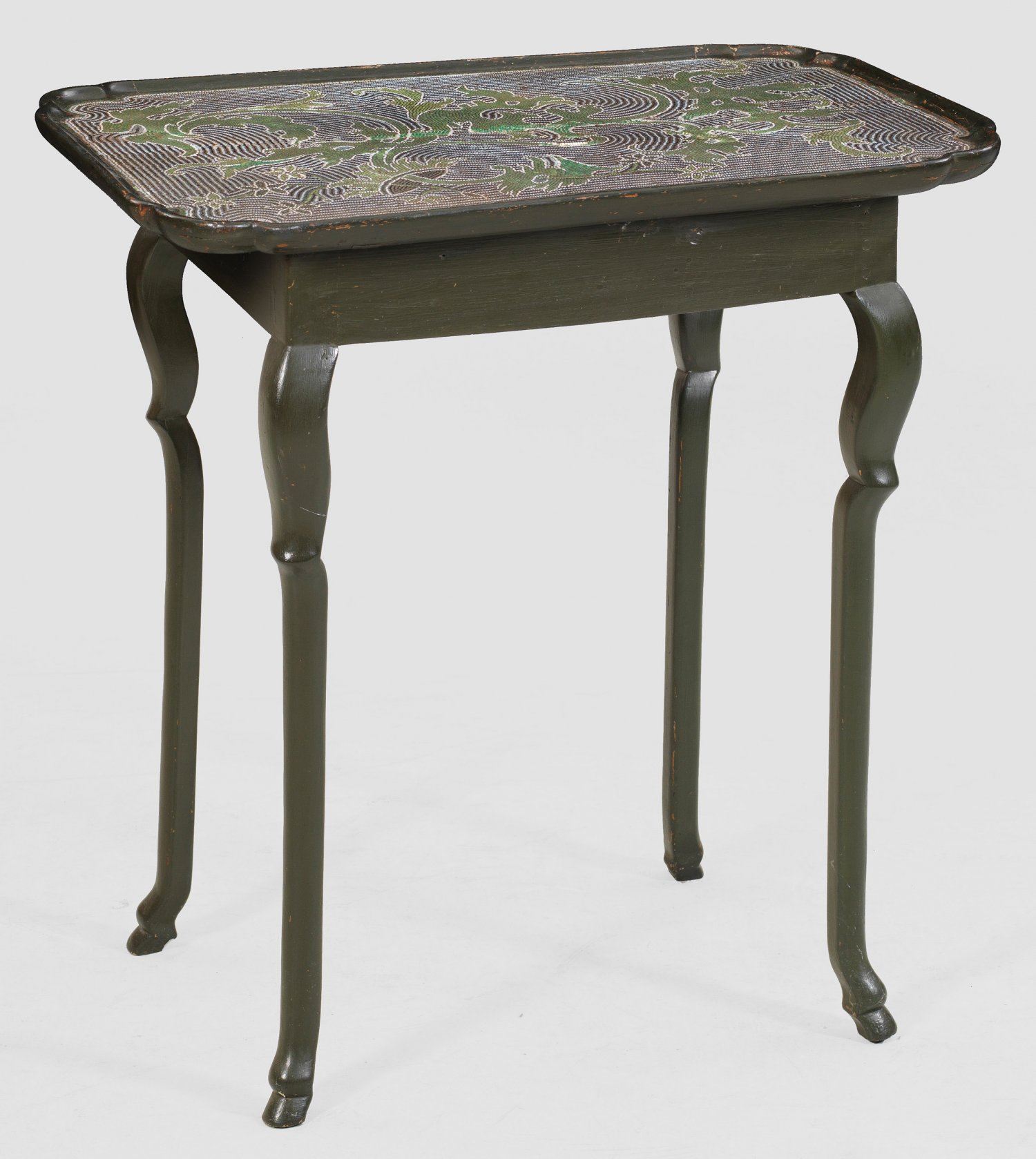 Perlmosaik-Tisch der Manufaktur Selow Holz, schwarz-grün gefasst. Gerade, rechteckige Zarge auf hohen, geschweiften Beinen mit stilisierten Bocksfüßen. Rechteckige Deckplatte mit gerundeten Ecken und flacher Galerierahmung. Im Spiegel flächendeckendes Perlmosaik aus großzügig angelegter Blattranke in unterschiedlichen Grün- und Blautönen sowie Weiß. Teilw. rest und besch.; H. 75 cm. 71 cm x 46 cm.