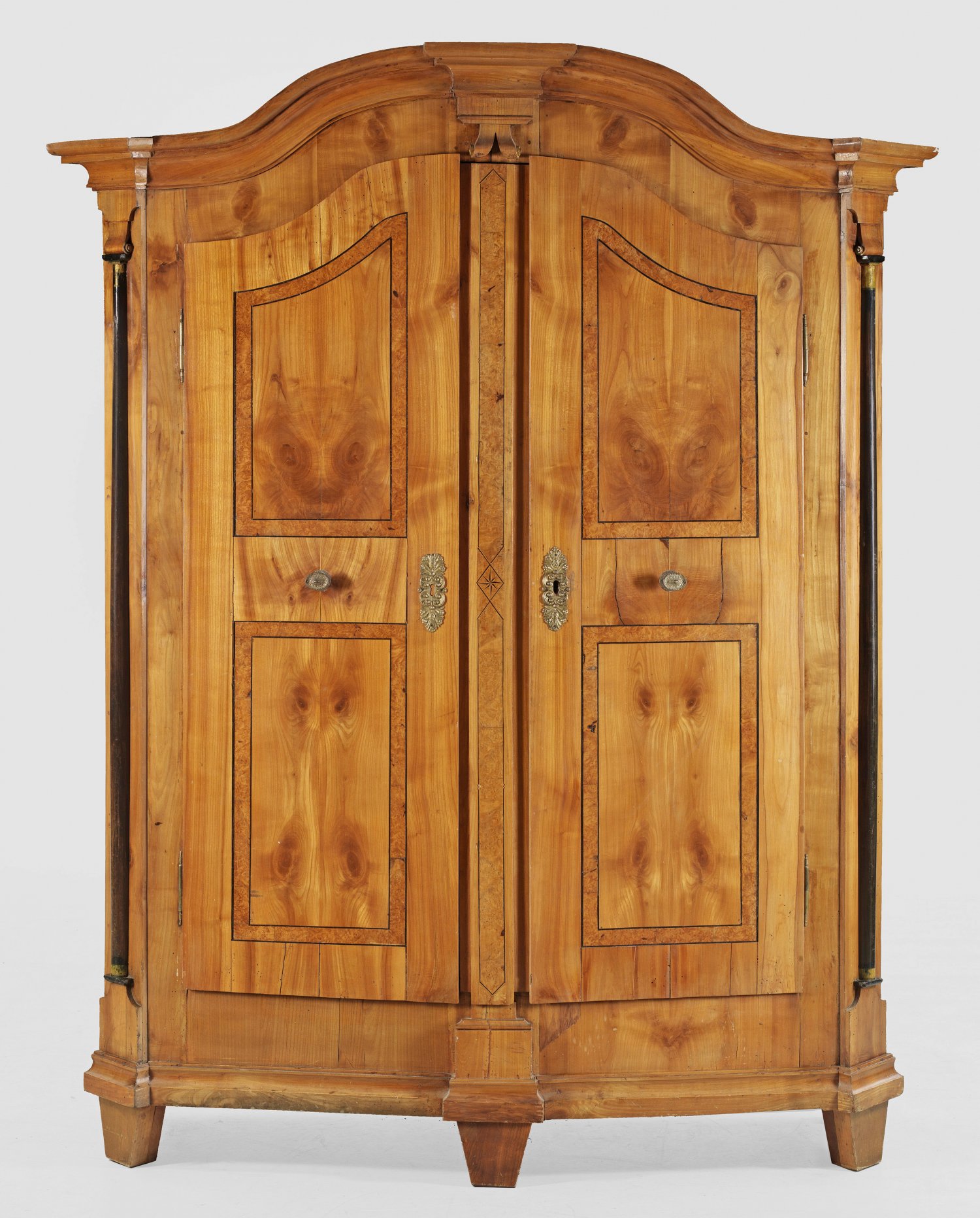 Klassizistischer Dielenschrank Kirschbaum, furniert. Gerader, hochrechteckiger Korpus, flankiert von breiten, schräggestellten Ecklisenen auf schmaler Profilzarge und konischen Füßen. In der gegliederten Front zwei schräggestellte Türen. Umlaufend gekehltes, mittig hoch aufgeworfenes Kranzgesims mit verkröpften Ecken. Flächendeckende Furnierfelder, schauseitig von schmalen Bandeinlagen begrenzt. H. 202 cm. 166 cm x 55 cm.