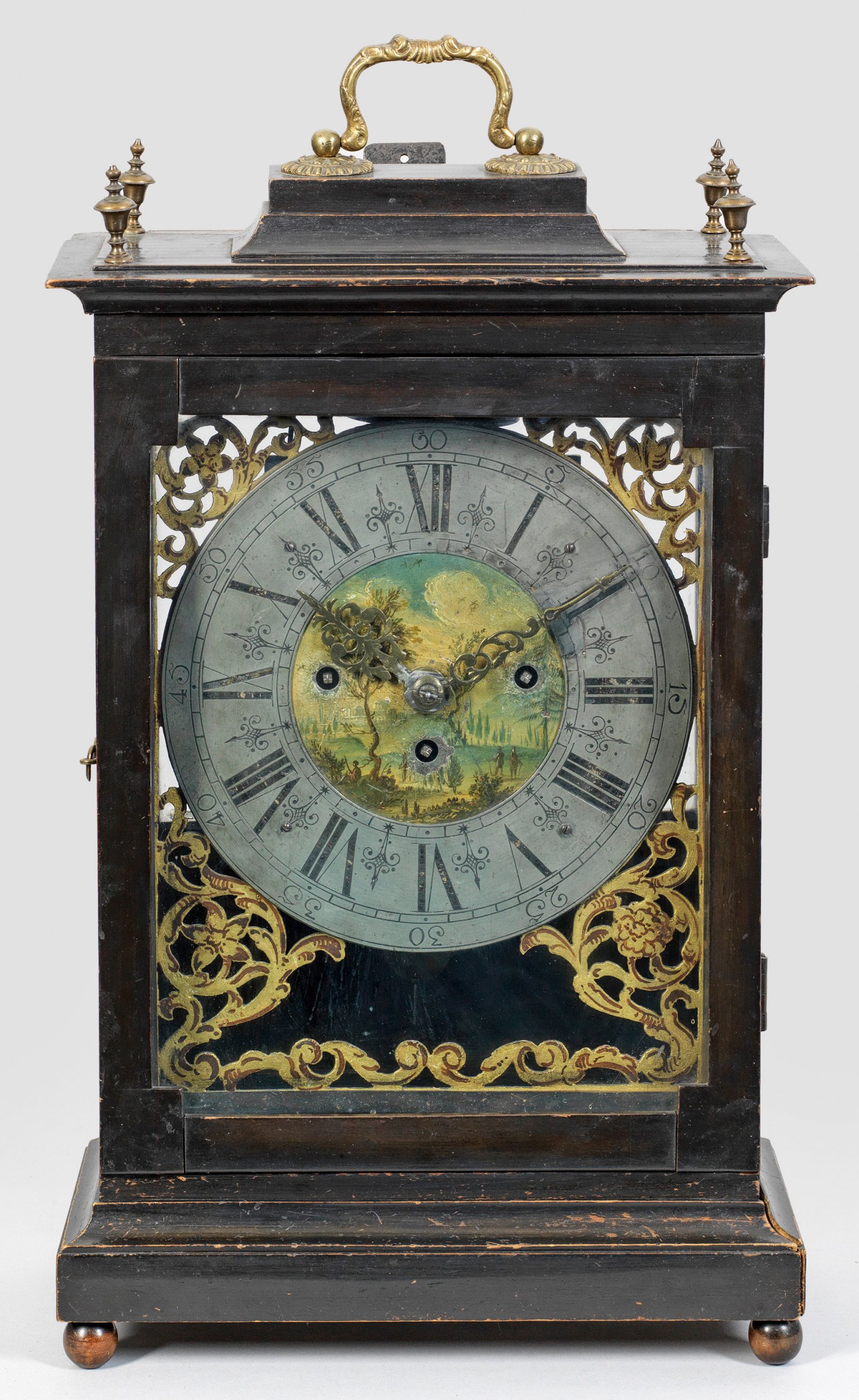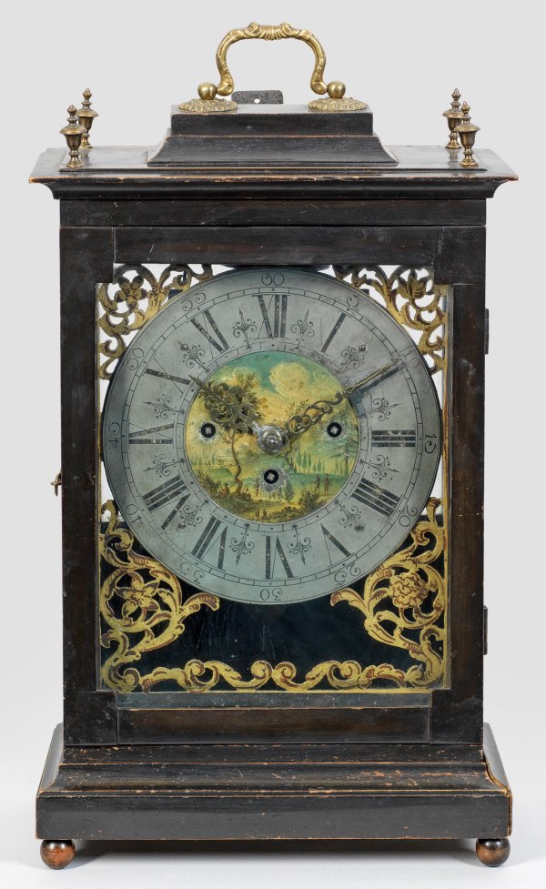 Barock-Stutzuhr Holz, ebonisiert. Hochrechteckiges, zweiseitig verglastes Uhrengehäuse auf gekehltem Profilsockel mit gestuft ansteigendem oberen Abschluss und aufstellbarem Volutengriff. Durchbrochen gearbeitetes Zifferblatt mit unw. besch. Zinn-Ziffernring sowie polychrom gestalteter Landschaftsdarstellung. Werk mit Repetition sowie Viertelstundenschlag auf zwei Glocken. H. 53 cm.