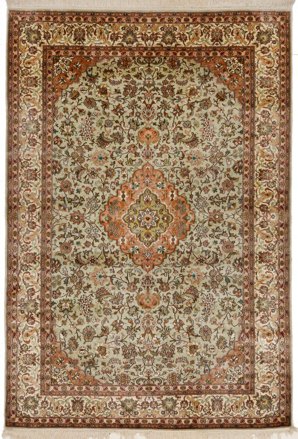 Kaschmir-Seidenbrücke Indien. Seide auf Seide. Sehr feine Knüpfung. Auf cremefarbenem Fond großes roséfarbenes Zentralmedaillon mit Anhängern sowie passig geschweifte Ecklösungen. Flächendeckend dichte Musterung aus Blütenranken. Umlaufend hellgrundige Bordüre aus üppigem Rankenwerk. 189 cm x 128 cm.