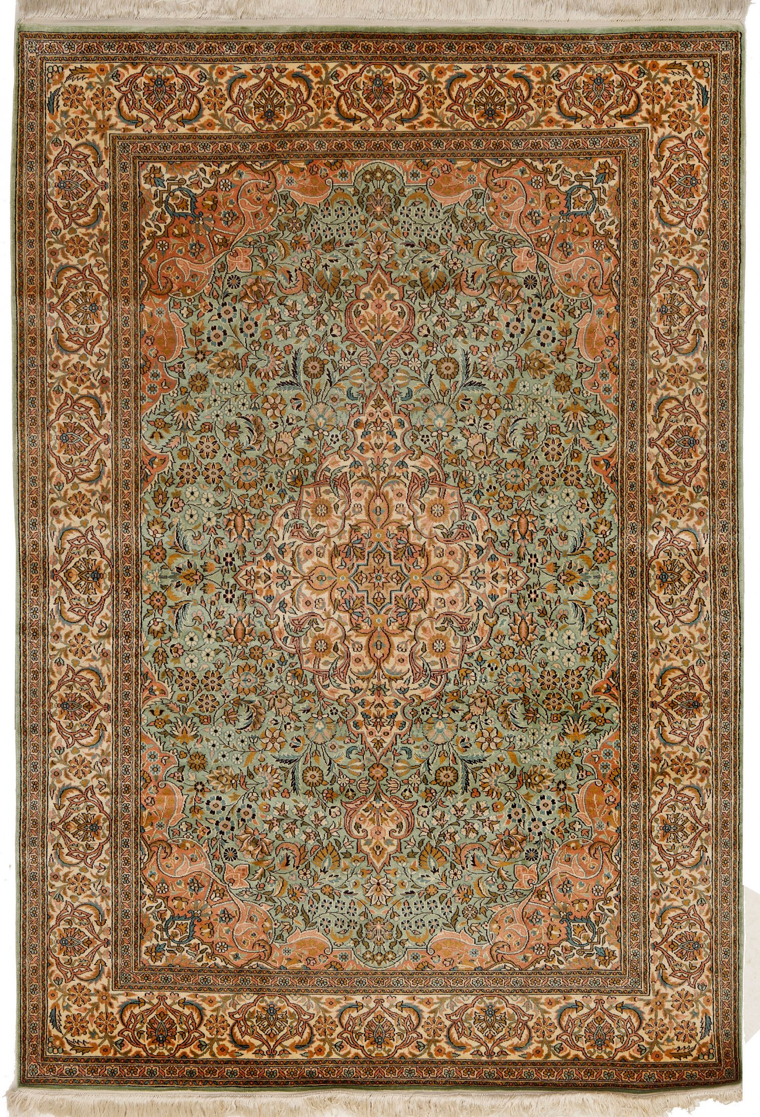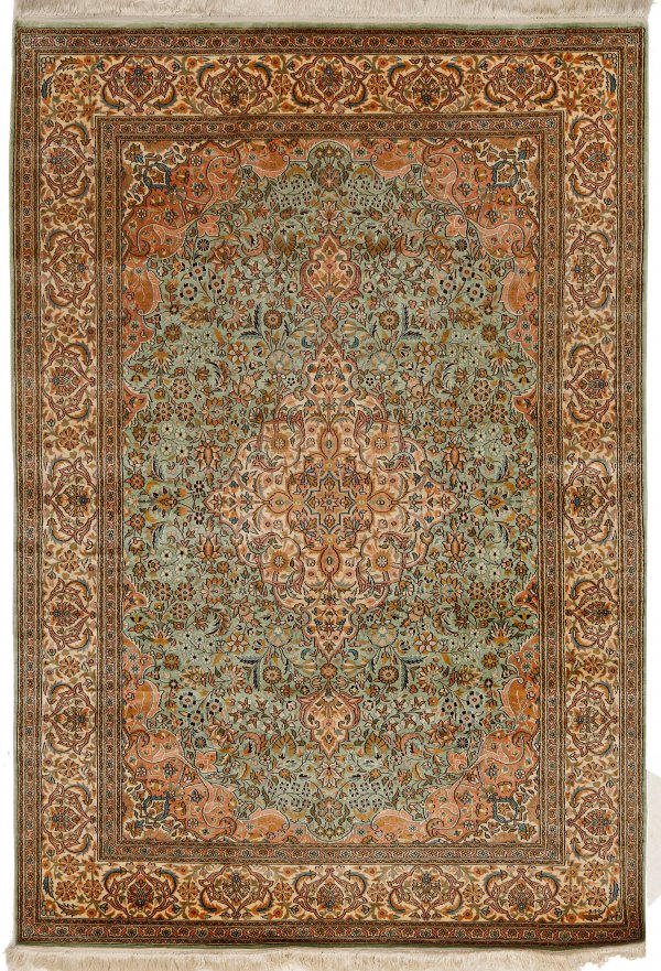 Kaschmir-Seidenbrücke Indien. Seide auf Seide. Sehr feine Knüpfung. Im türkisfarbenen, passig geschweiften Innenfeld roséfarbenes Zentralmedaillon mit Anhängern sowie korrespondierende Ecklösungen. Flächendeckend dichte Blütenmusterung. Umlaufend cremefarbene Palmettenbordüre. 182 cm x 122 cm.