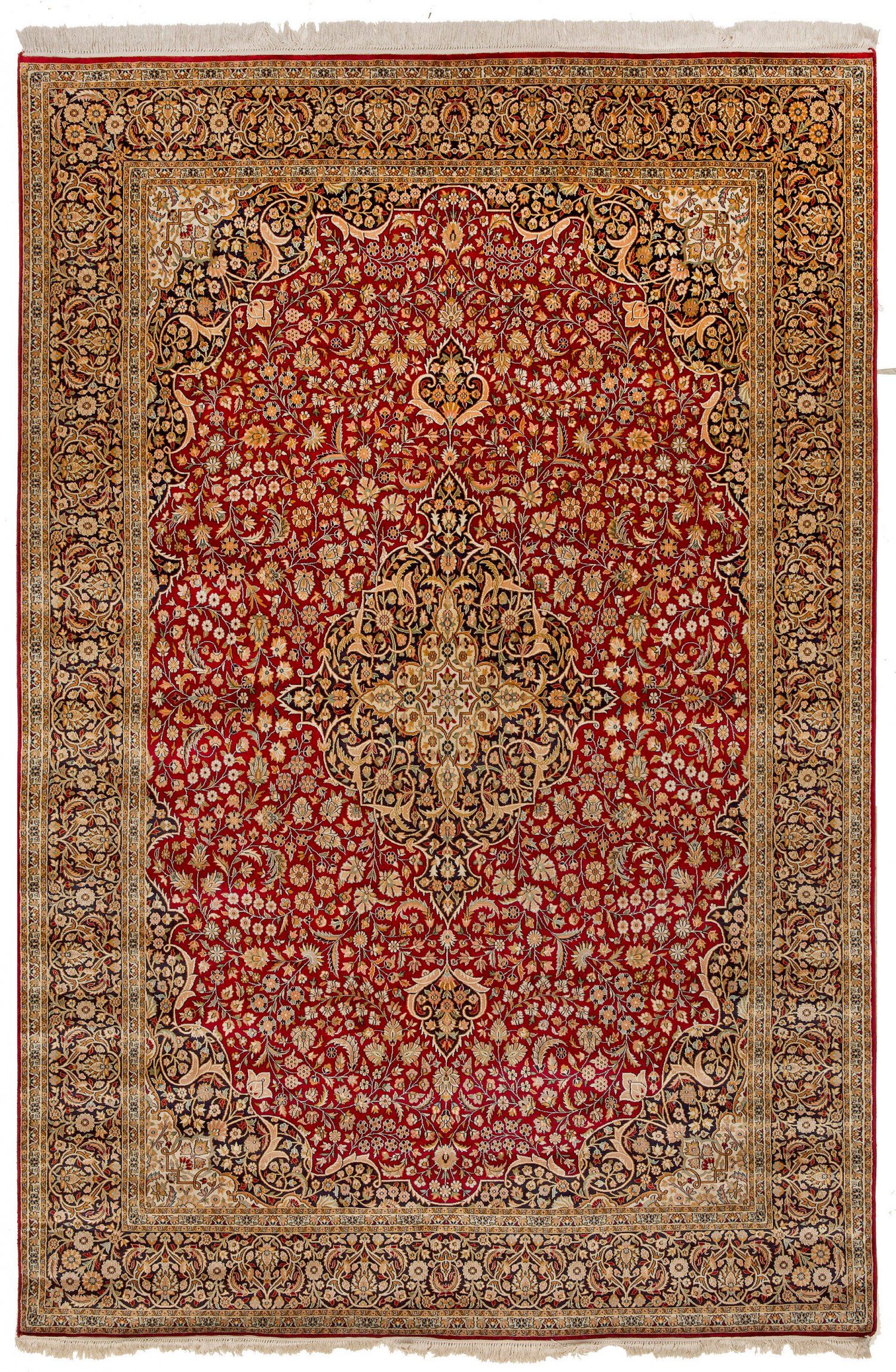 Kaschmir-Seidenteppich Indien. Seide auf Seide. Sehr feine Knüpfung. Auf rotem Fond großes dunkles Zentralmedaillon mit Anhängern sowie breiten, passig geschweiften Ecklösungen. Flächendeckend dichte Musterung aus Blütenranken. Umlaufend dunkelgrundige Bordüre aus üppigen Palmettenranken. 270 cm x 181 cm.