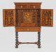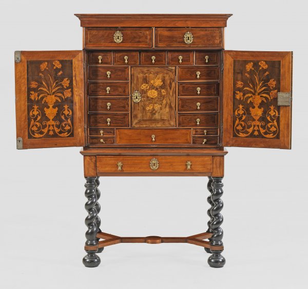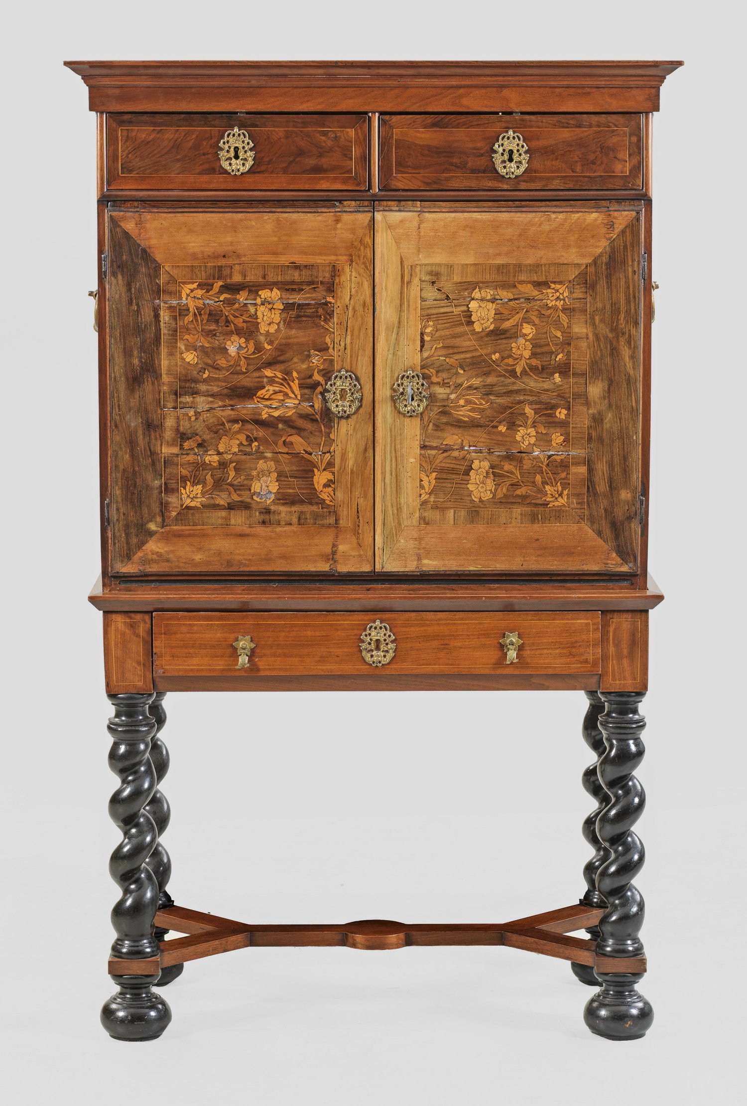 Kabinettschrank Nussbaum, furniert sowie Einlagen aus unterschiedlichen Edelhölzern. Gerader, rechteckiger Korpus mit seitlichen Griffen sowie profiliertem Kranzgesims. In der gegliederten Front zwei Schubfächer sowie zwei Türen mit intarsierten Tulpen und Blattwerk. Dahinter eingelegte Vasenmotive, begleitet von üppigen eingerollten Blattvoluten sowie gestaffelte Kabinetteinteilung aus zentraler Tabernakeltür sowie diversen Schubfächern. Unterhalb erg. gerader Zargenkasten mit ausziehbarer Arbeitsfläche aus dunkelrotem Leder auf gedrehten Balustersäulen, durch breite Stege verbunden. Altersspuren. H. 171 cm. 105 cm x 50 cm.