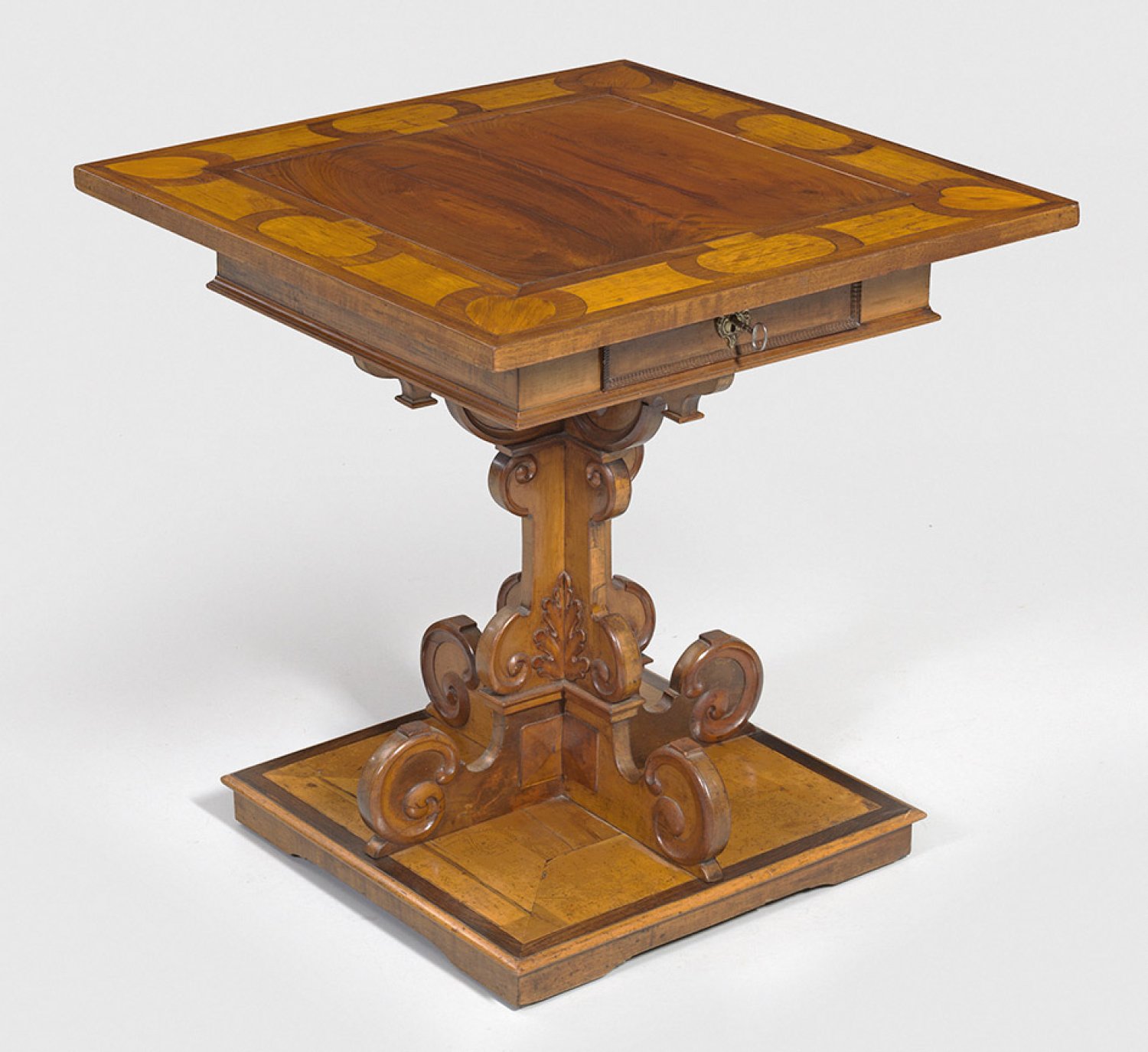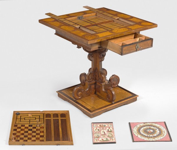 Seltener Barock-Spieltisch Nussbaum, furniert und teilw. reliefplastisch geschnitzt. Balusterförmiger Schaft aus gegeneinander gestellten Wangen mit reliefplastischen Voluten auf flacher Sockelplatte. Oberhalb einschübiger Zargenkasten als Träger für weit überstehende Deckplatte. In der Mitte breit gerahmtes, über einen Schnappmechanismus fixiertes Spielbrett mit intarsierten Spielflächen für Schach und Mühle. Unterhalb eingelassene Spielfläche für Backgammon, flankiert von herausnehmbaren Kästen für Spielsteine. Gedrechselte Spielfiguren für Schach und Mühle sowie Spielplaketten aus gefärbtem Bein. Dazu zwei weitere, polychrom bemalte Spielbretter. H. 75 cm. 73,5 cm x 73,5 cm.