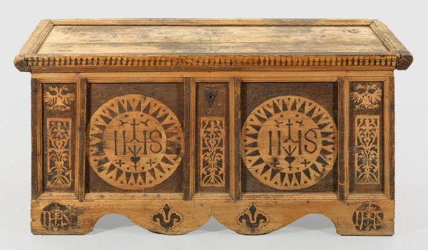 Große Flachdeckeltruhe Kiefernholz. Gerader, querrechteckig angelegter Korpus auf gesägtem Zargensockel. In der Front flächendeckender, gekämmter Dekor aus großen Reserven mit IHS sowie Doppelkopfadler. Dem Korpus entsprechender Flachdeckel. Innen sog. Hohe Kante. H. 81 cm. 174 cm x 71 cm.